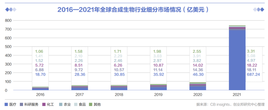 从细分市场来看,医疗、科研服务和化工行业是主要应用领域。其中增长最明显的是医疗领域,超过七成的药物发现来自生物,2021年市场规模达到687.24亿美元;其次是化工领域,合成生物学市场规模18.22亿美元;科研服务领域合成生物学市场规模18.11亿美元;农业领域合成生物学市场规模为4.97亿美元;食品领域合成生物学市场规模为5.08亿美元;其他领域合成生物学市场规模为3.31亿美元。