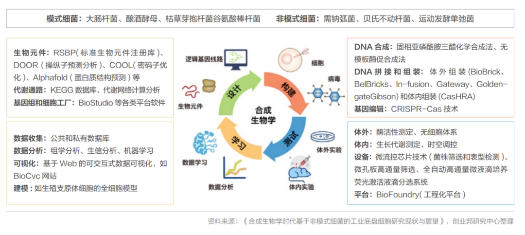 ①底盘细胞:底盘细胞是合成生物学的“硬件”基础,其中常用的模式微生物有酿酒酵母、大肠杆菌、枯草芽孢杆菌、谷氨酸棒杆菌等。不同的模式微生物具有特定的优缺点,因此被应用于不同产物的生产。相关技术:菌株改造、菌株选择。
