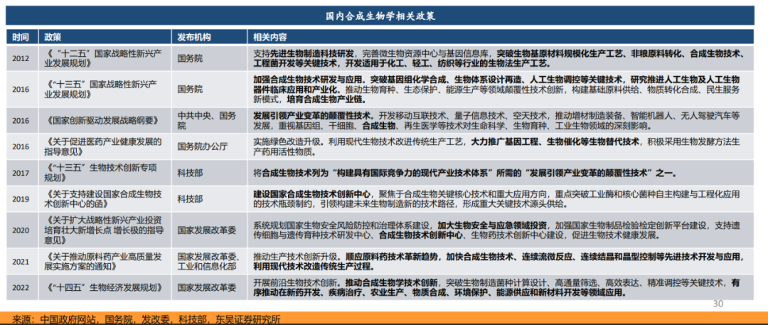 中国合成生物产业处于高速发展时期,国家持续出台政策助力产业发展。从“十二五”,国家提出对生物制造技术的支持;到“十三五”,国家将合成生物技术列为引领产业变革的颠覆性技术之一。此后国家出台一系列政策支持合成生物的发展,“十四五”更是强调了对生物合成的应用,在政策的大力支持下,合成生物产业也迎来了重要的发展机遇。