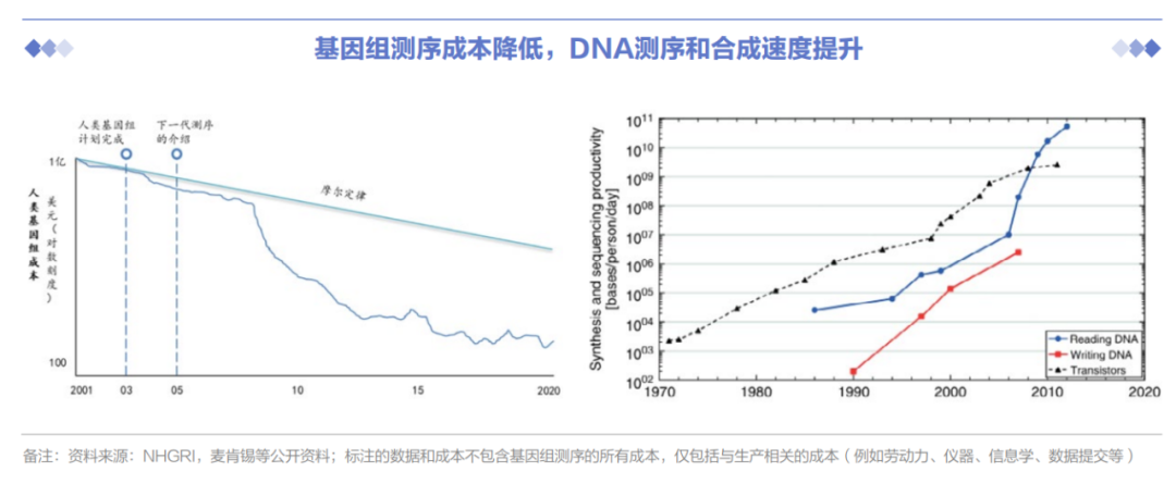 底层技术成本指数级下降,带来下游合成生物学应用爆发。随着生命科学技术的发展和应用场景的拓宽,底层的基因合成与基因测序服务能力得到了极大的提升,价格上,基因测序与基因合成的成本下降速率明显快于摩尔定律,2021年每Mb的基因合成成本约为0.006美元,而每个基因组的测序成本约为562美元,更低的成本使得这些技术大规模应用成为了可能。