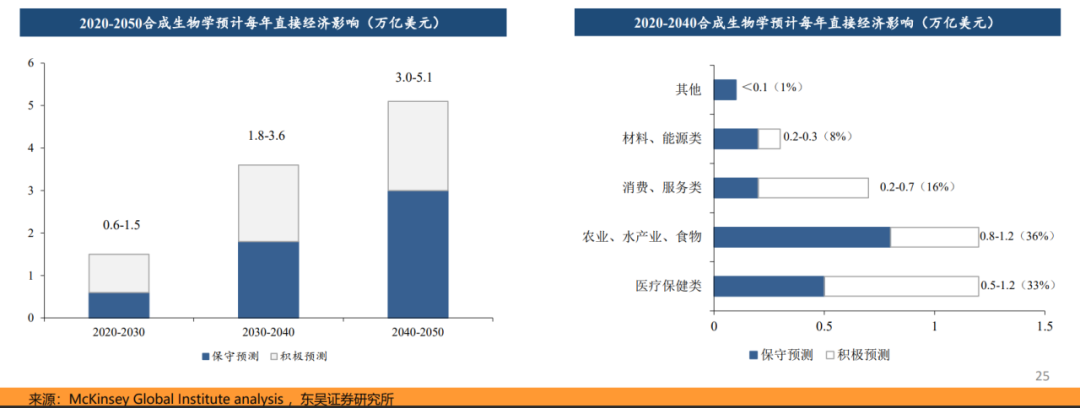据麦肯锡预测,2030-2040年期间,合成生物学每年在医疗健康方面潜在影响将达到0.5至1.2万亿美元,最终有望解决全球疾病总负担的45%。