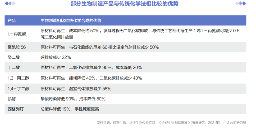 随着合成生物学快速发展,对细胞代谢和调控认知的深入以及技术手段的进步,使得优化改造、从头设计合成高效生产菌种成为可能,可再生化学品与聚合材料的生产能力与效率大大提升,与此同时可大幅减少原材料和能源消耗,大幅降低生产成本。