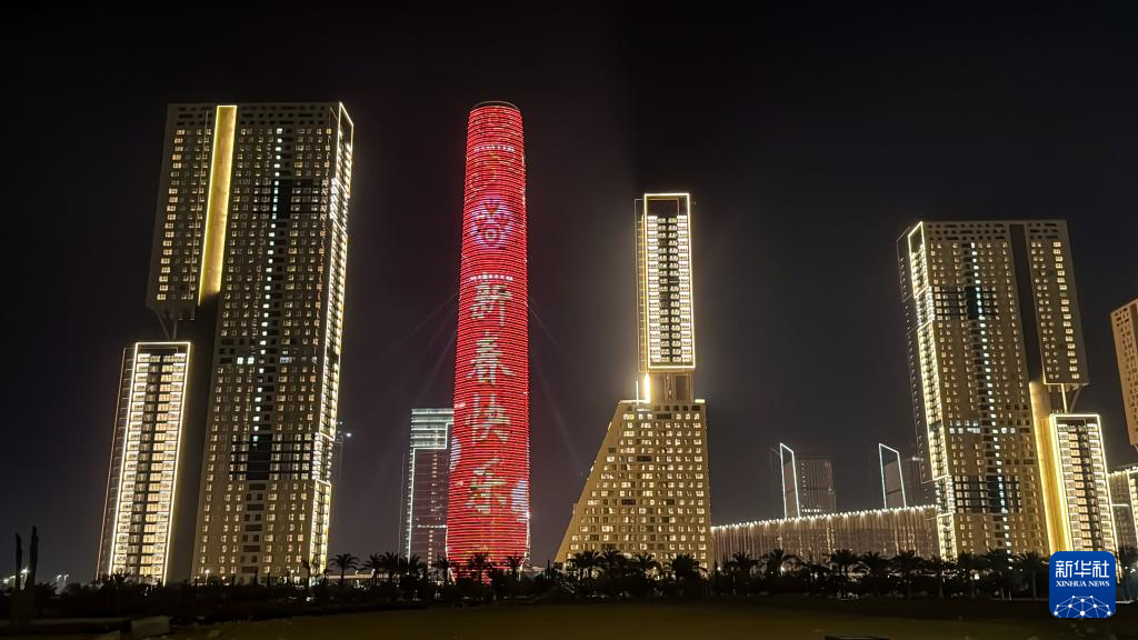 这是1月19日在埃及新行政首都中央商务区拍摄的被点亮的“标志塔”。当晚,由中国建筑股份有限公司埃及分公司承建的埃及新行政首都中央商务区项目上,被誉为“非洲第一高楼”的“标志塔”被灯光点亮,迎接中国新年。