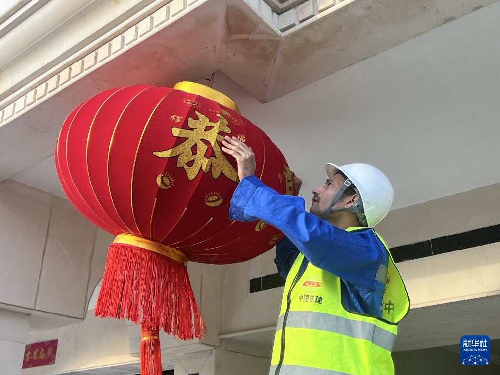 1月29日,在沙特阿拉伯中铁十八局集团沙特公司吉达分部,外籍员工挂上灯笼,体验中国迎接新年的习俗。