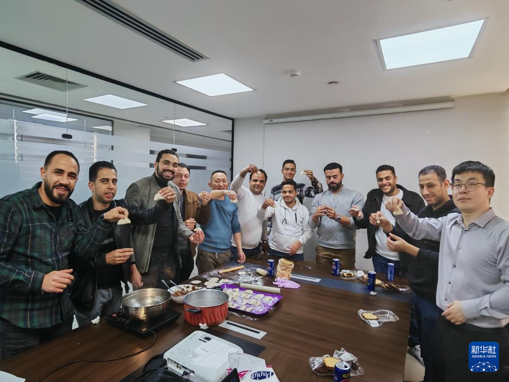 1月26日,在埃及开罗,西电国际工程有限公司埃及分公司中外员工一起包饺子,迎接中国新年。