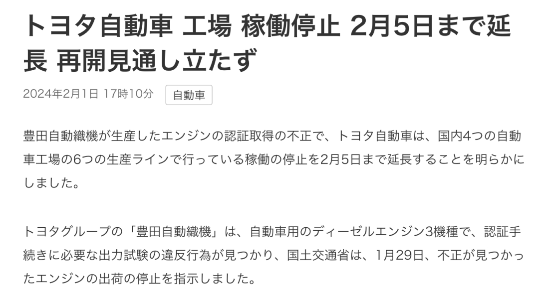 具体来看:丰田在日本的销量下降13.8%,为144.18万辆。实际上,对于丰田去年在日本市场销量下滑并不意外。2023年开始丰田集团就受旗下丰田自动织机测试违规丑闻影响,多次宣布停工。2023年12月20日,丰田汽车集团旗下子公司大发工业发文表示,发现25个新测试项目存在174起造假案件,被确认为欺诈的车型数量为64款车型和3款发动机,包括已经停产的车型。除了大发品牌外,还包括为丰田代工生产的车型。大发汽车决定暂停目前在日本和海外生产的所有大发开发车型的出货,彼时丰田也决定暂停这些车型的出货。