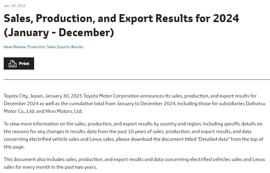 1月30日,丰田汽车官网公布去年全球销量。数据显示:去年丰田汽车全球销量为1082.148万辆,与2023年相比减少了3.7%。对于全球销量的下滑,官方表示主要是受认证违规导致部分工厂停产、日本市场的萎缩及中国市场竞争激烈,中国的销量低于上年销量等因素所致。