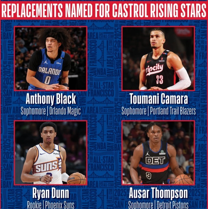 邓恩将替补76人新秀贾里德-麦凯恩,后者因半月板伤势,赛季报销。布莱克、卡马拉和汤普森将取代德里克-莱夫利(脚踝骨折)、布兰登-米勒(右手腕受伤)和维克托-文班亚马。而文班亚马则是因为入选全明星正赛,而今年全明星改制后,这两项赛事相连。