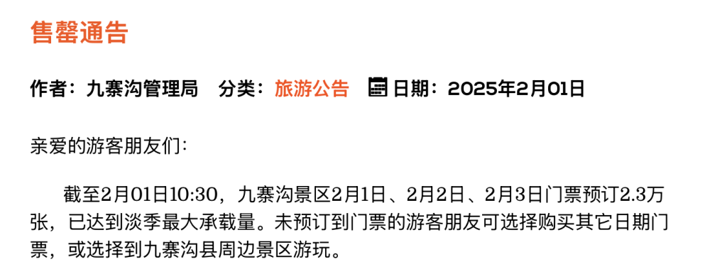 2月1日上午,九寨沟管理局发布的公告还显示,九寨沟景区2月2日和2月3日的门票预订也已达最大承载量的2.3万张。
