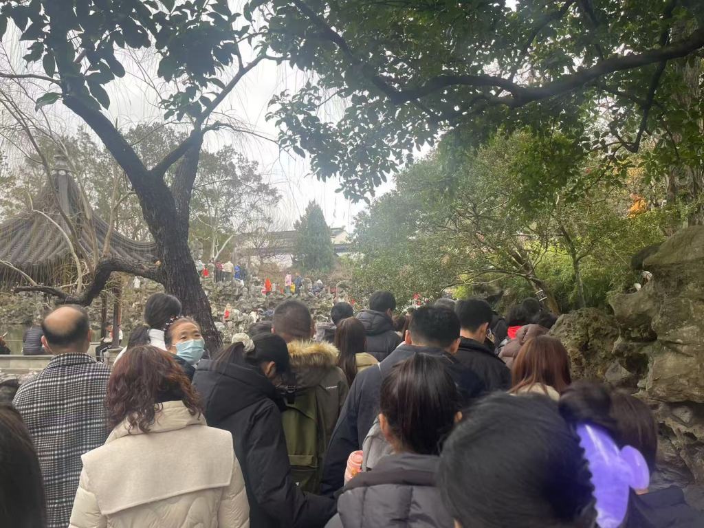 “狮子林假山堵人了!”2月1日一早,就有前往苏州狮子林游玩的游客向澎湃新闻发来了旅游景点“人从众”的照片。
