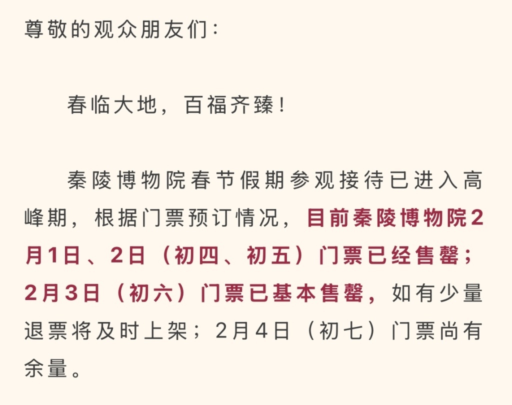 1月31日晚间,西安发布的消息显示,陕西省部分景区、博物馆门票已经售罄、约满。其中秦始皇陵博物院截至2月3日的门票已基本售罄,如有少量退票将及时上架;2月4日门票尚有余量。截至1月31日19:00,陕西历史博物馆(本馆)2月6日前的门票全部约满;陕西历史博物馆秦汉馆2月1日-2月4日门票全部约满;陕西考古博物馆2月5日前的场次全部约满;西安博物院2月6日前的场次全部约满。