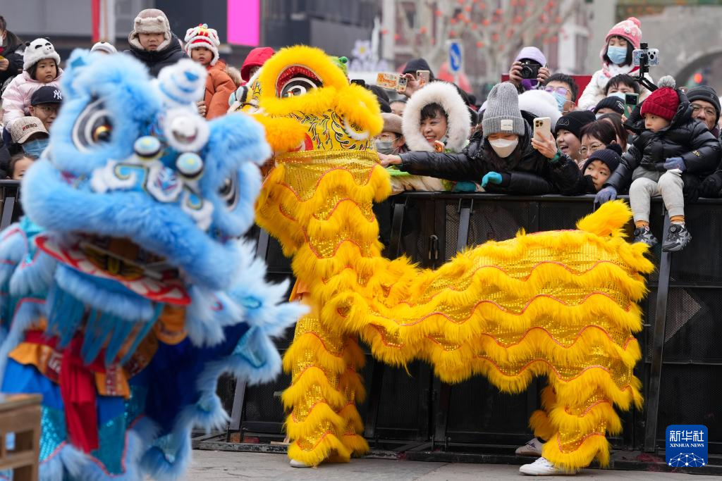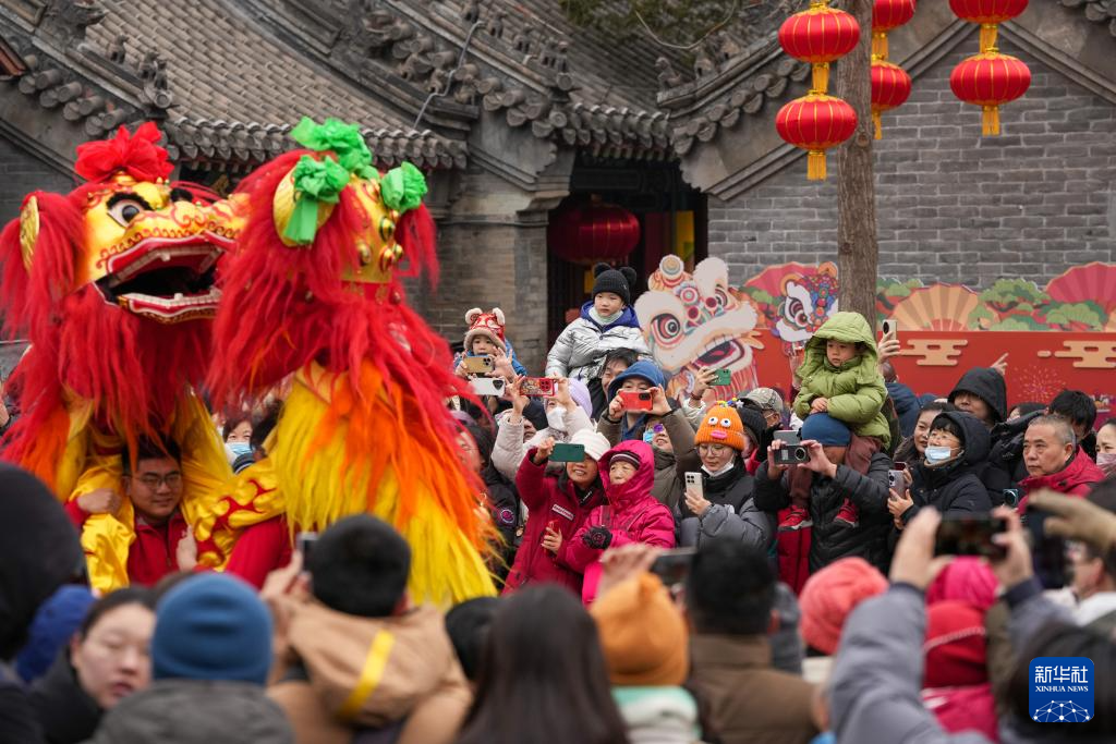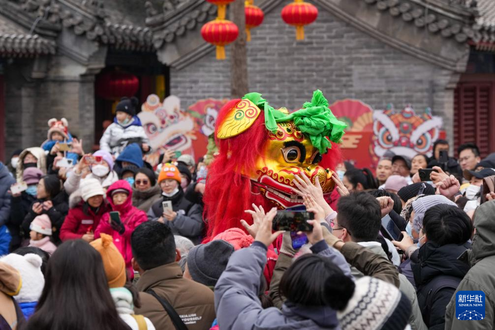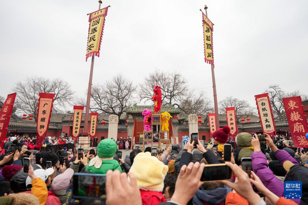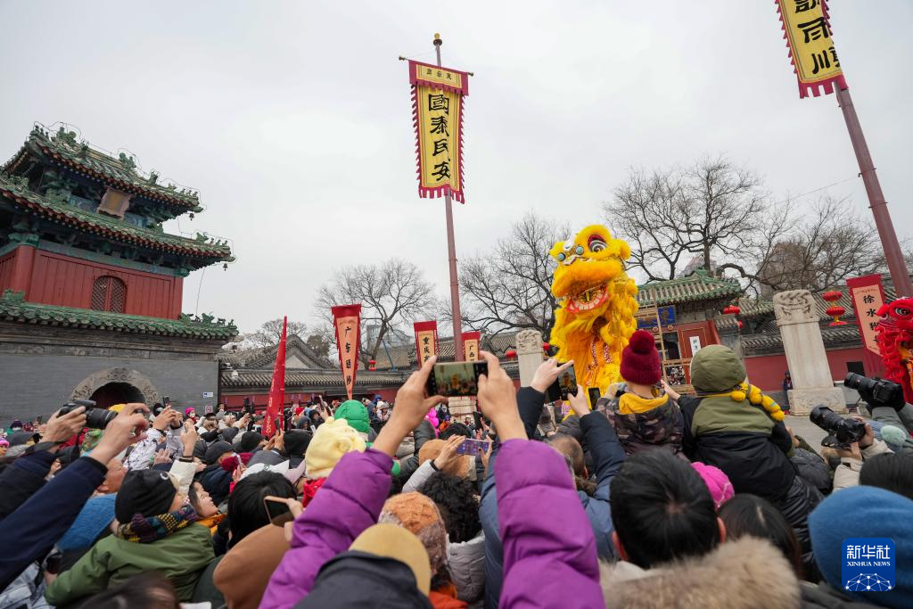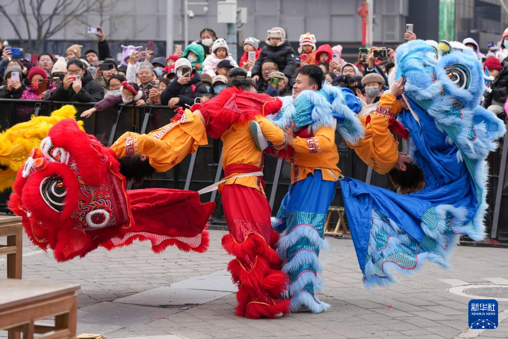 为庆贺蛇年春节,在北京民俗博物馆举行的北京东岳庙庙会上,来自全国各地的七支舞狮队伍为市民游客进行舞狮表演,共贺新春。