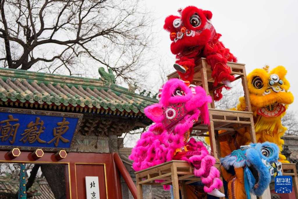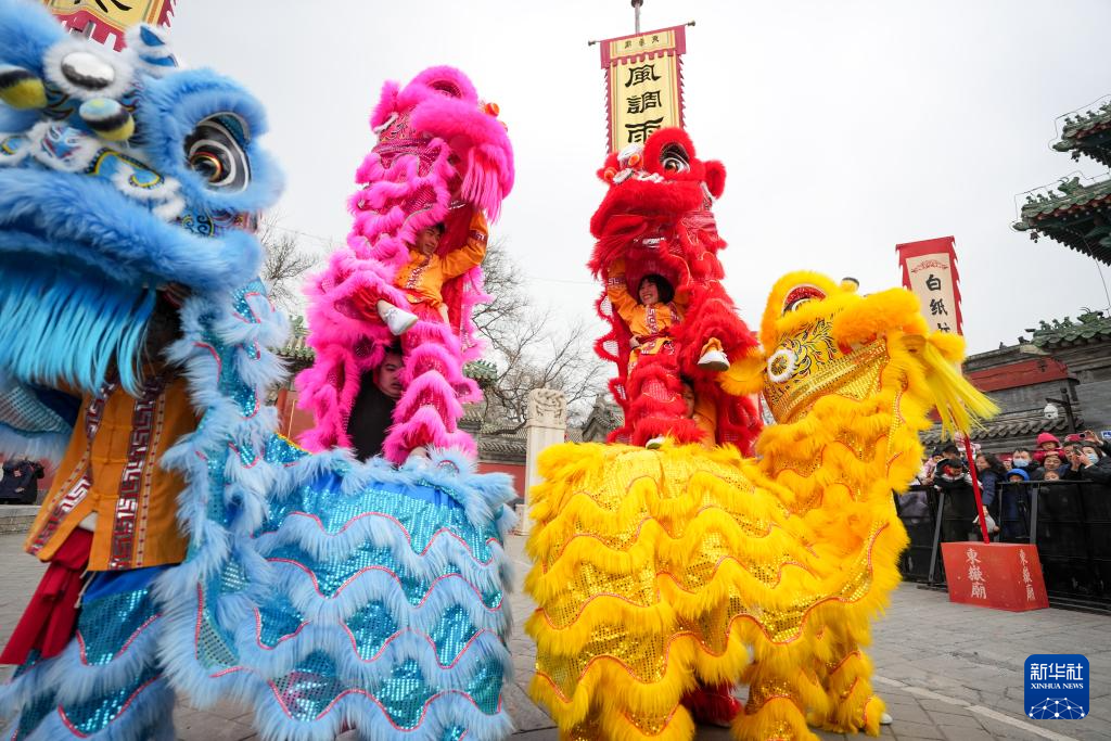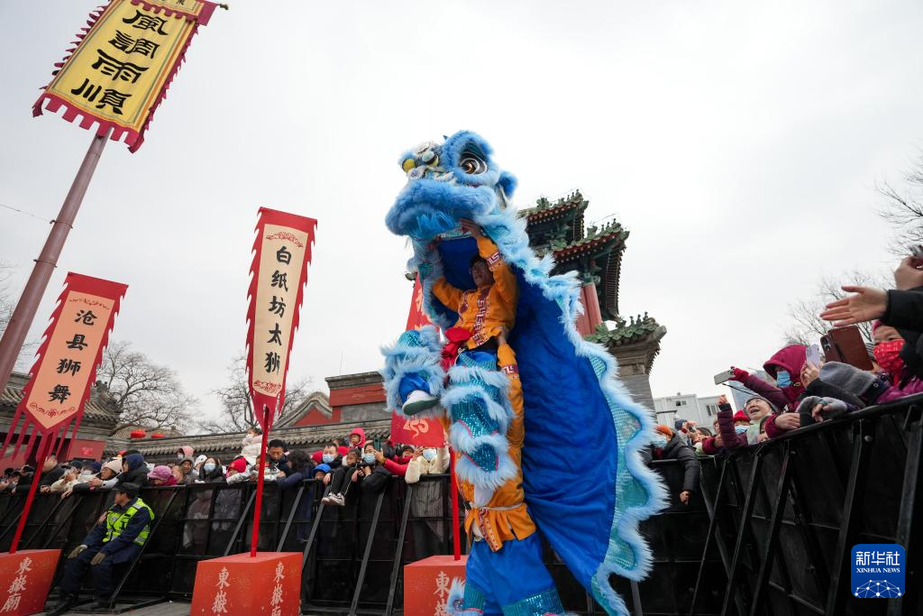 2月1日,在北京民俗博物馆举行的北京东岳庙庙会上,来自河北徐水的舞狮队伍在表演。