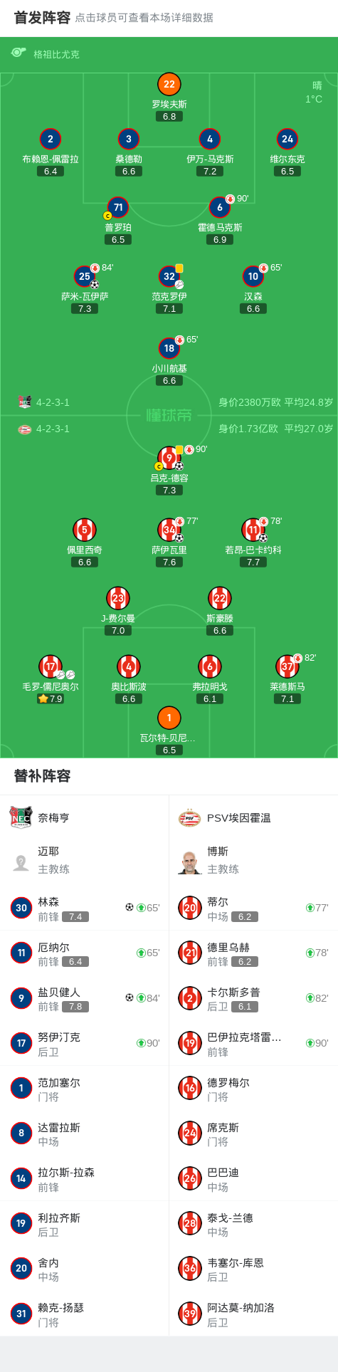 第52分钟,PSV埃因霍温球员吕克-德容打入一球。