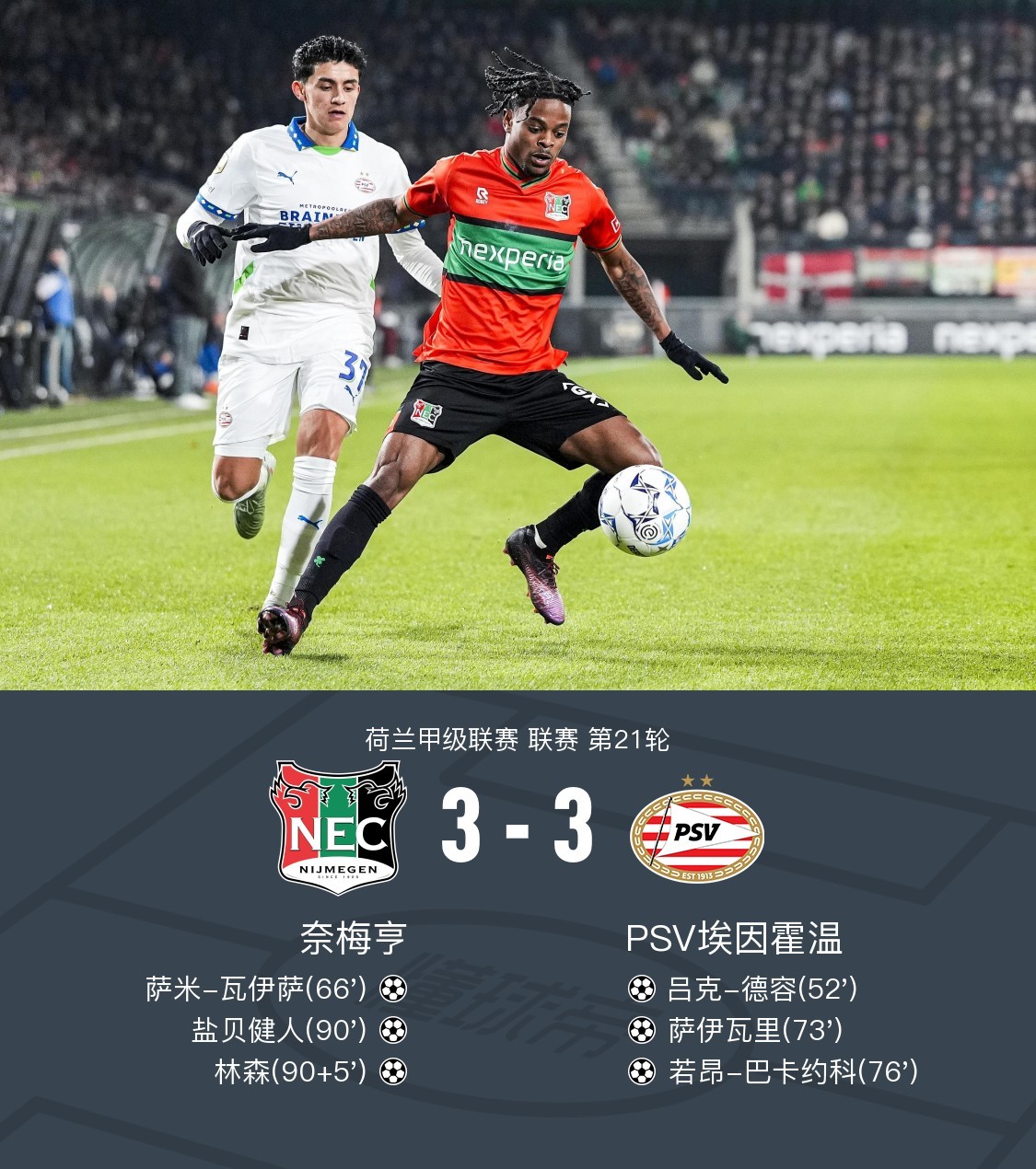 在荷兰甲级联赛第21轮的较量中,奈梅亨坐镇主场迎战PSV埃因霍温。埃因霍温的吕克-德容率先为球队打开局面,随后奈梅亨的萨米-瓦伊萨迅速扳平比分。毛罗-儒尼奥尔表现出色,连续两次助攻队友,先是帮助萨伊瓦里再度将比分超出,接着又助攻若昂-巴卡约科扩大领先优势。 然而,奈梅亨并未放弃,盐贝健人为主队再度缩小差距。最后时刻,范克罗伊助攻林森完成绝平进球。最终,奈梅亨与埃因霍温以3-3的比分结束了这场精彩的对决。