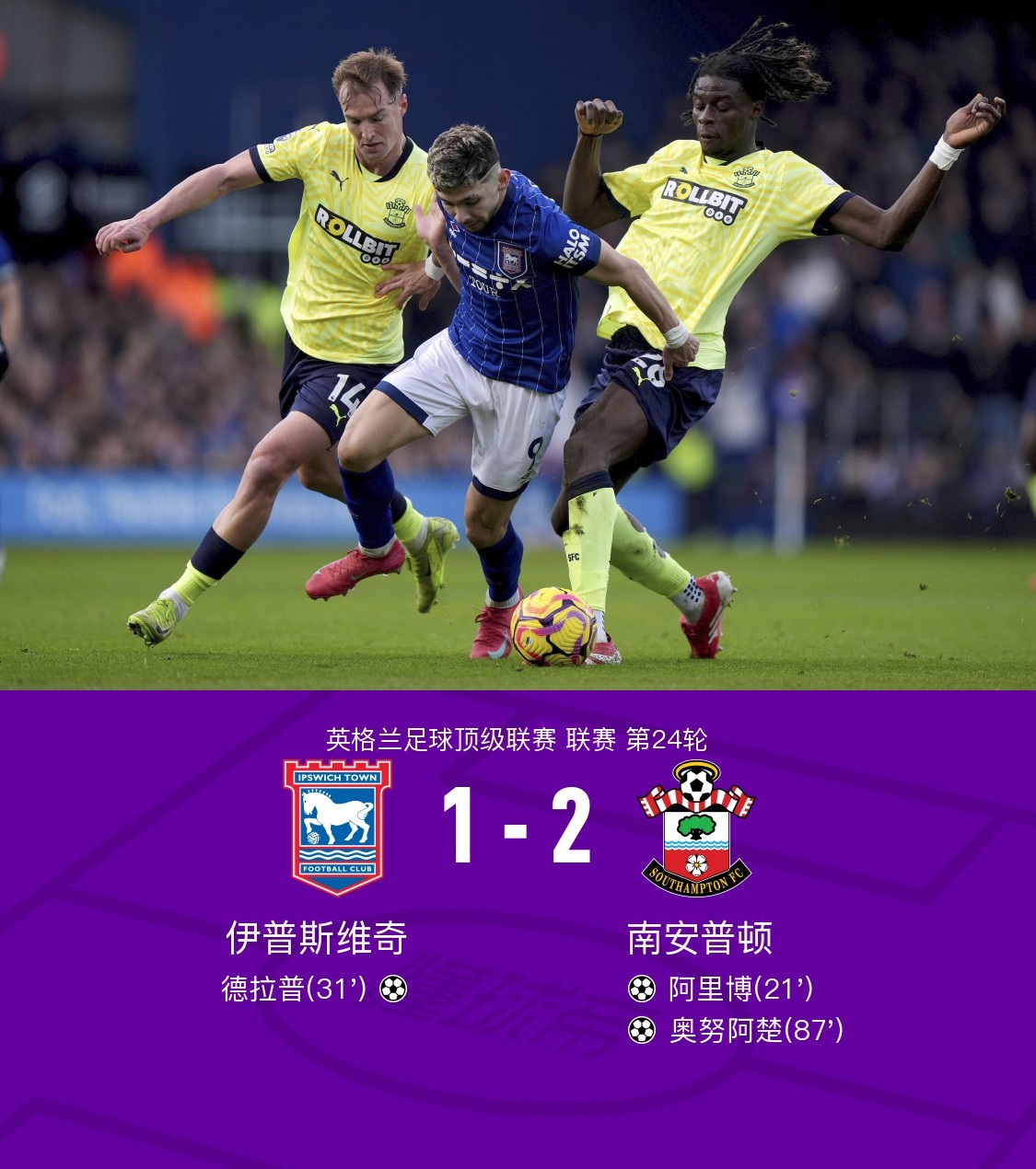 在英格兰足球顶级联赛第24轮的较量中,伊普斯维奇坐镇主场迎战南安普顿。比赛中,南安普顿的阿里博率先为球队取得进球,随后伊普斯维奇的德拉普迅速扳平比分。比赛接近尾声时,南安普顿的奥努阿楚再度攻入一球,帮助球队锁定胜局。最终,南安普顿以2-1战胜伊普斯维奇。