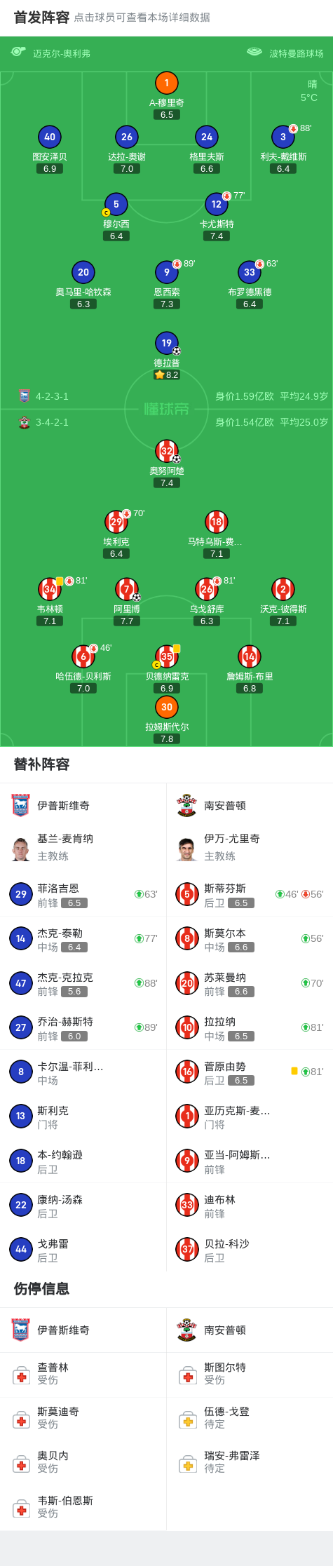 第30分钟,扳平比分,德拉普单刀推射破门,伊普斯维奇1-1