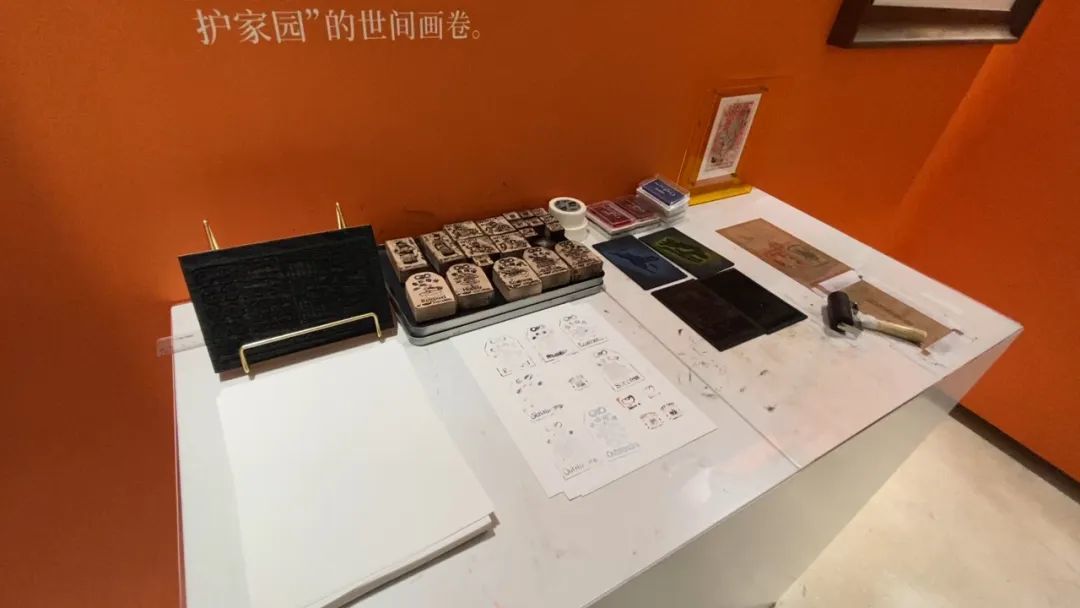 想要做一幅小校场年画,首先要绘制好一幅最终的图案,按颜色进行分稿,然后进行雕刻。现场一个展示柜里放了拳刀、毛刷等制作工具,还有一个特别的互动体验区,有成品木版和石版。