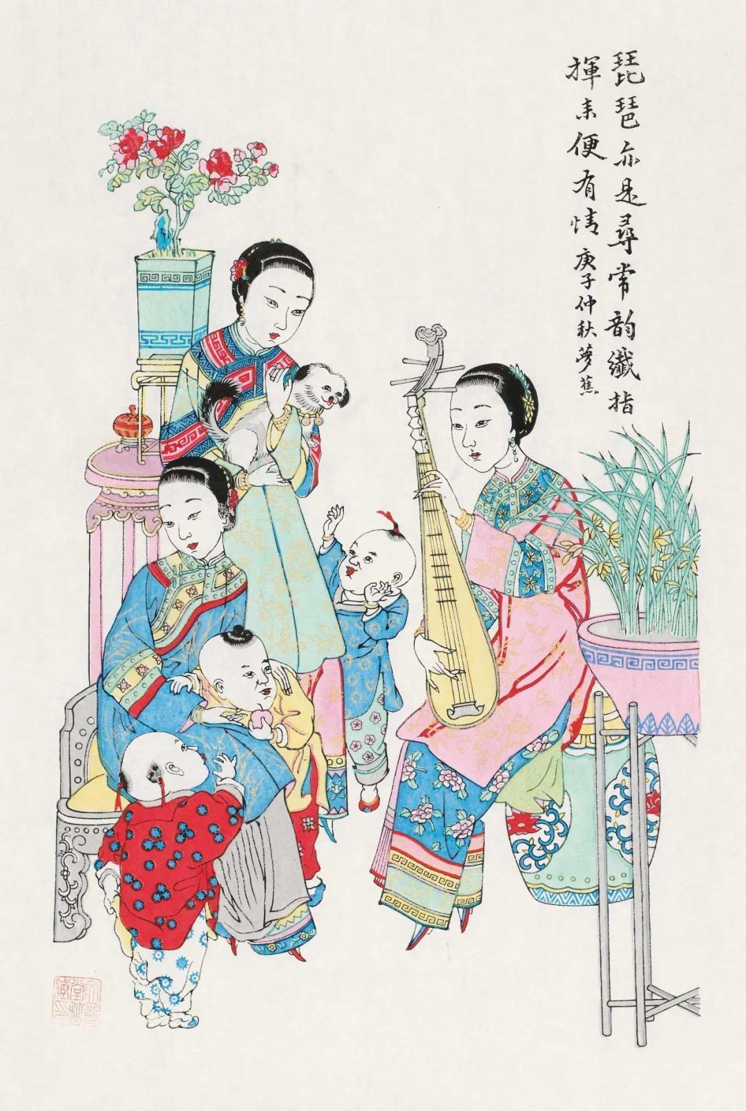 展览中,作为区级非遗代表性传承人的他拿出了一幅复刻作品《琵琶有情》。“上海小校场年画是传统年画时代最后的繁荣,它将中国传统木版年画的制作技艺都融于一身,还结合了上海的海派文化内容。”
