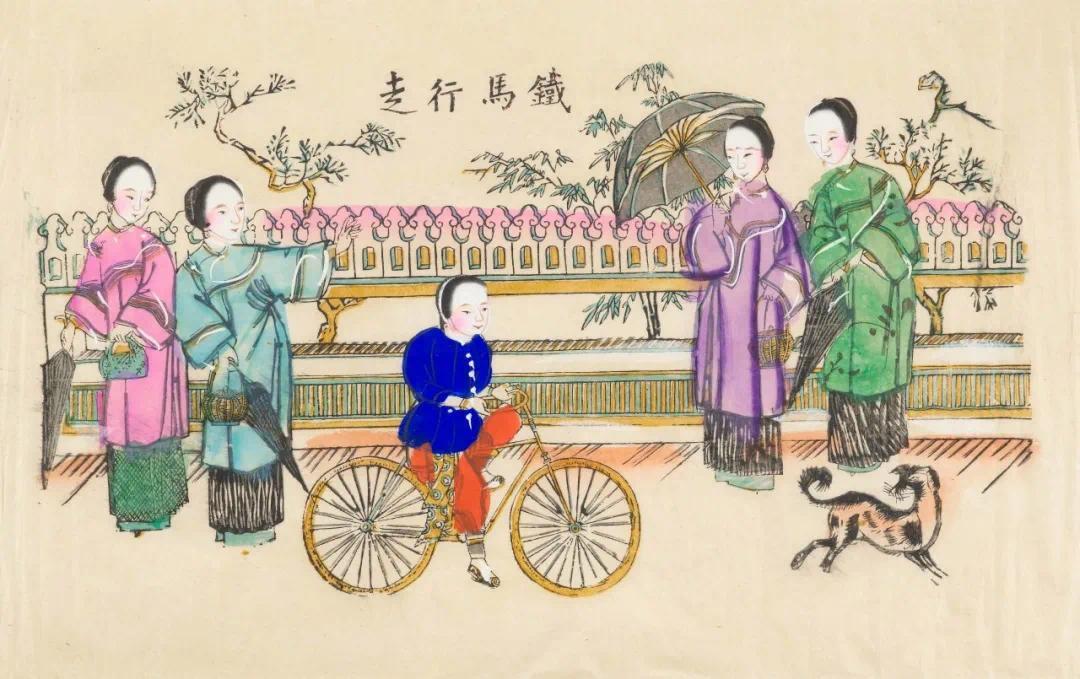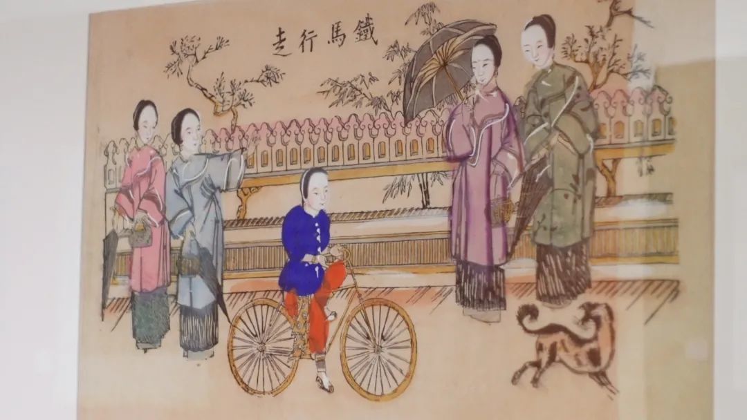 刚进展厅看到的第一幅,是清代的木版年画《铁马行走》,四名女子观看一少年在马路上骑自行车。李文墨说,年画是反映老百姓精神世界与民俗生活的生动写照。“当时,由于自行车是一个外来的新事物,融入到中国传统年画里面。民间艺人也特别风趣地说叫‘铁马行走’,像马一样,但是可以代步的意思。一些建筑的围墙,还有妇女的服饰以及宠物,从年画里面也能充分看出中国近代化的过程。”