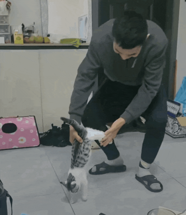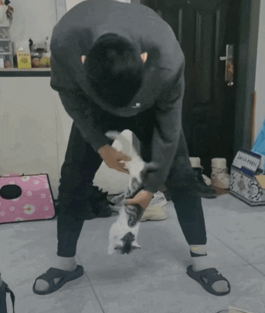 只见老爸一个倒拔垂杨柳,小猫咪四爪离地,随后双手配合地心引力交替搓动,修猫彻底陷入撸猫循环!