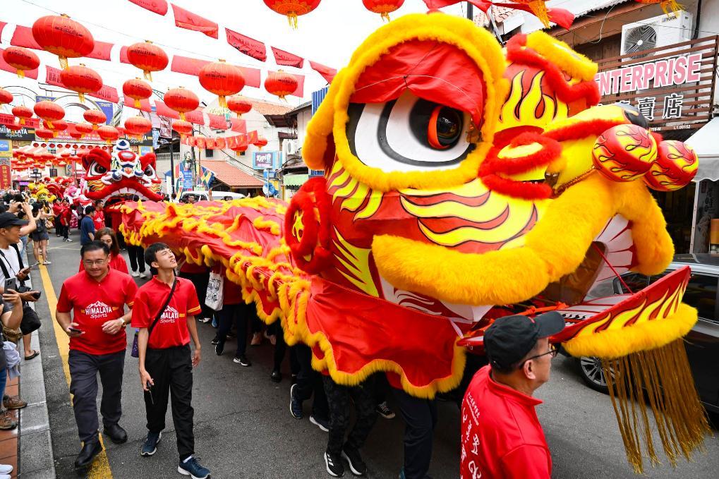 1月21日,在马来西亚马六甲市鸡场街,人们舞动“马中友谊瑞狮”,迎接新春 。新华社记者程一恒摄
