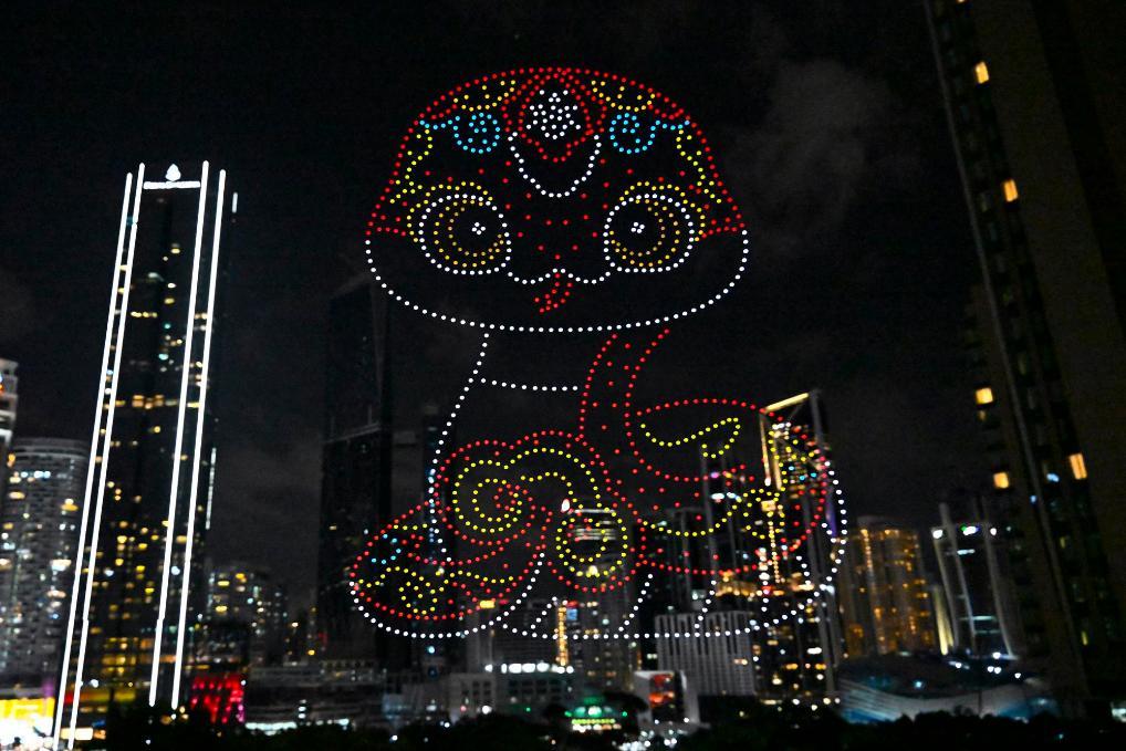 1月25日,在马来西亚吉隆坡举行的2025年“欢乐春节”全球启动仪式前,无人机展示蛇年主题图案。新华社记者程一恒摄
