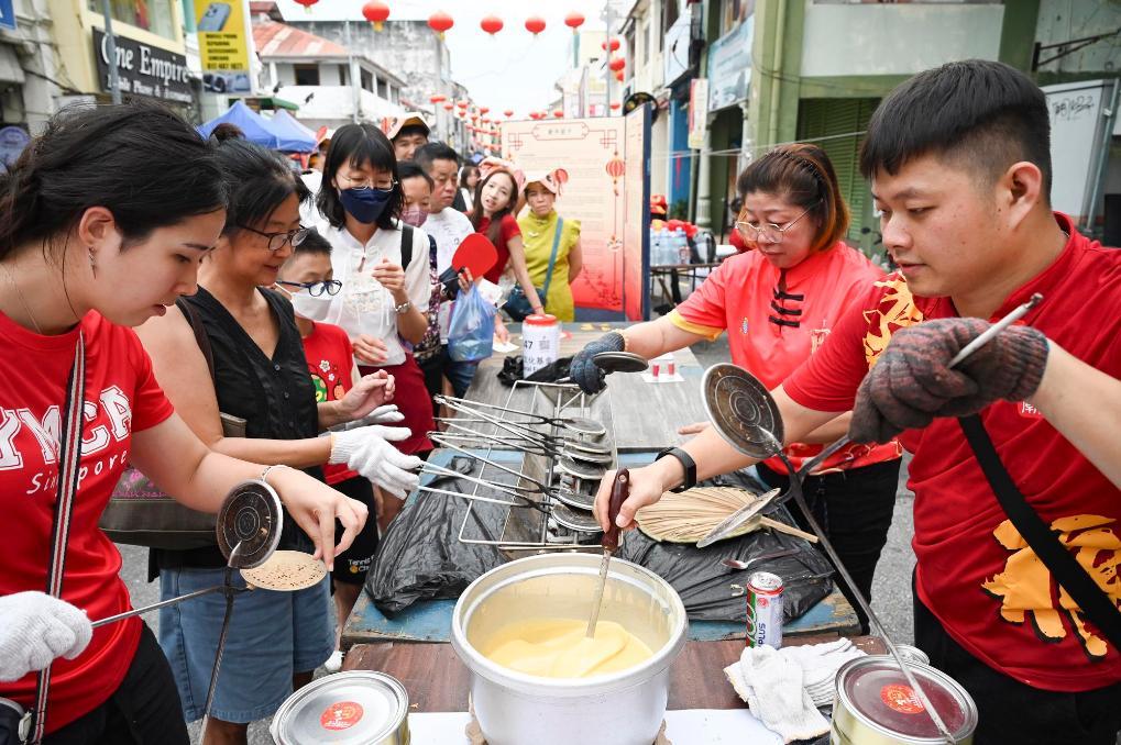 2月1日,人们在马来西亚槟城庙会上体验年饼制作。新华社发(李奕慧摄)