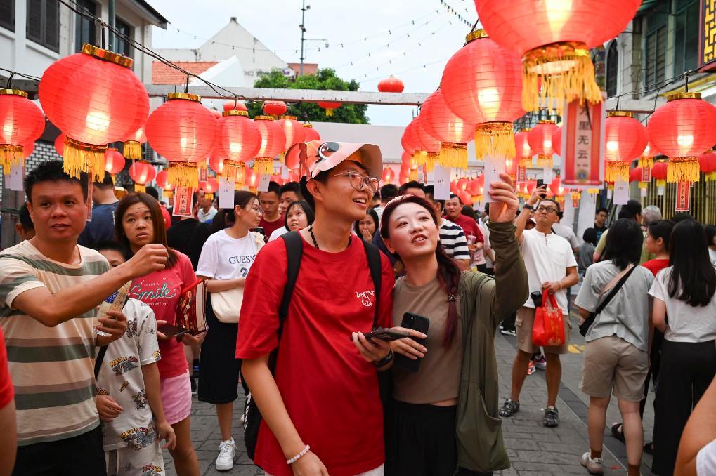 2月1日,人们在马来西亚槟城庙会拍照打卡。新华社发(李奕慧摄)