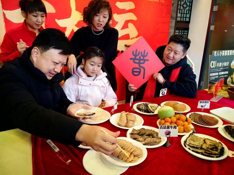 2月3日,北京青年报记者来到老字号天福号前门店,由天福号特邀的民俗老师正在为现场的家长和孩子们深入讲解了立春的由来与习俗。“立春日吃春饼称为‘咬春’。昔日,吃春饼时讲究到盒子铺去叫‘苏盘’(又称盒子菜)。盒子里分格码放酱肘子、松仁小肚、炉肉、熏鸡、酱鸭等,吃时需改刀切成细丝,另配几种家常炒菜,一起卷进春饼里吃。”透过民俗老师现场生动的讲述,在场的每一个人仿佛穿越时空,回到旧时立春时节。“老北京吃春饼最讲究,一定要卷成筒,从头吃到尾,寓意‘有头有尾’”。