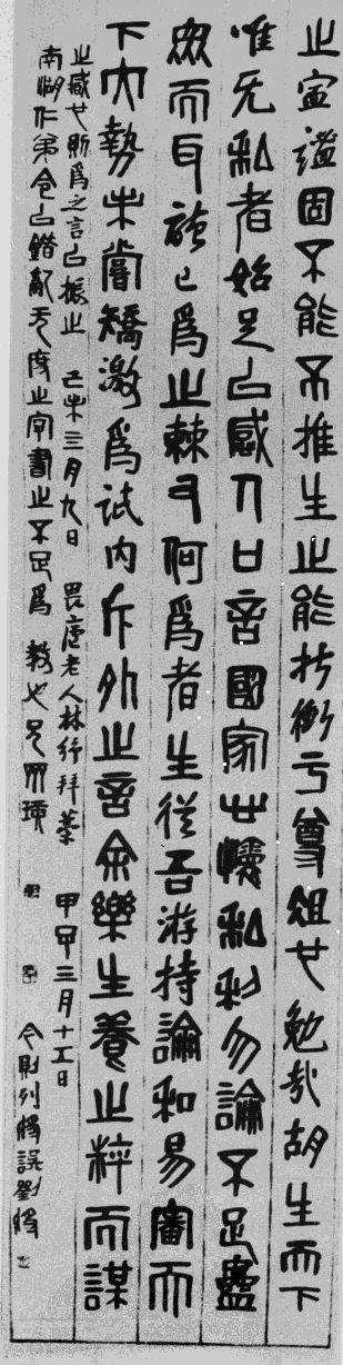 三月初二日。得吴缶老为定润格。此件南湖所赠也。其润格录于后:齐山人濒生为湘绮高弟子,吟诗多峭拔语。其书画墨韵孤秀磊落。兼善篆刻,得秦汉遗意。曩经樊山评定,而求者踵相接,更觉手挥不暇。为特重订如左:(文略)庚申岁暮,吴昌硕,年七十七。