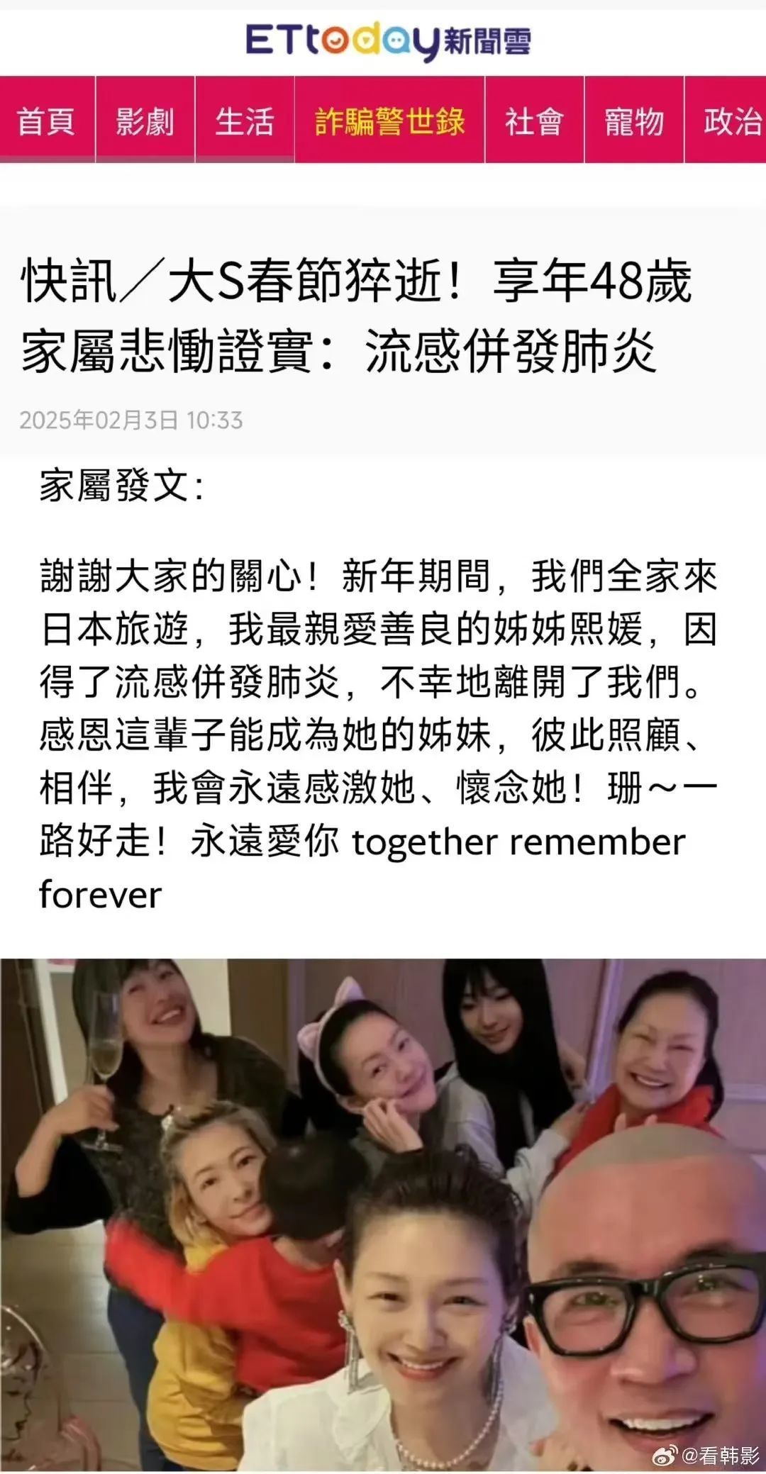 “谢谢大家的关心!新年期间,我们全家来日本旅游,我最亲爱善良的姐姐熙媛,因得了流感并发肺炎,不幸地离开了我们。感恩这辈子能成为她的姐妹,彼此照顾、相伴,我会永远感激她、怀念她!珊~一路好走!永远爱你 together remember forever!”