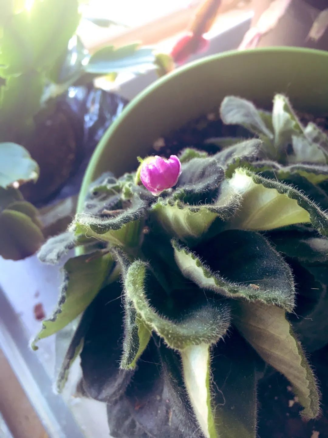 盆栽非洲紫罗兰养在窗台或阳台边,可以每隔一周转动花盆180度,让它的所有叶子都能接收到均匀的光照,让它保持良好的株型。