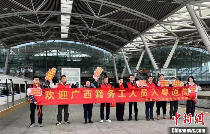 中新网广州2月3日电 (记者 程景伟)由广东省人力资源和社会保障部门策划组织的2025年春节后首趟务工人员入粤返岗专列D3755次列车,3日(正月初六)13时02分缓缓驶出来宾北站,并于16时30分抵达广州南站。
