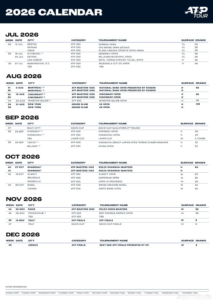 其中包含9站ATP1000大师赛,其中7站将采用升级后的12天赛制,16站ATP500赛事、29站ATP250赛事。