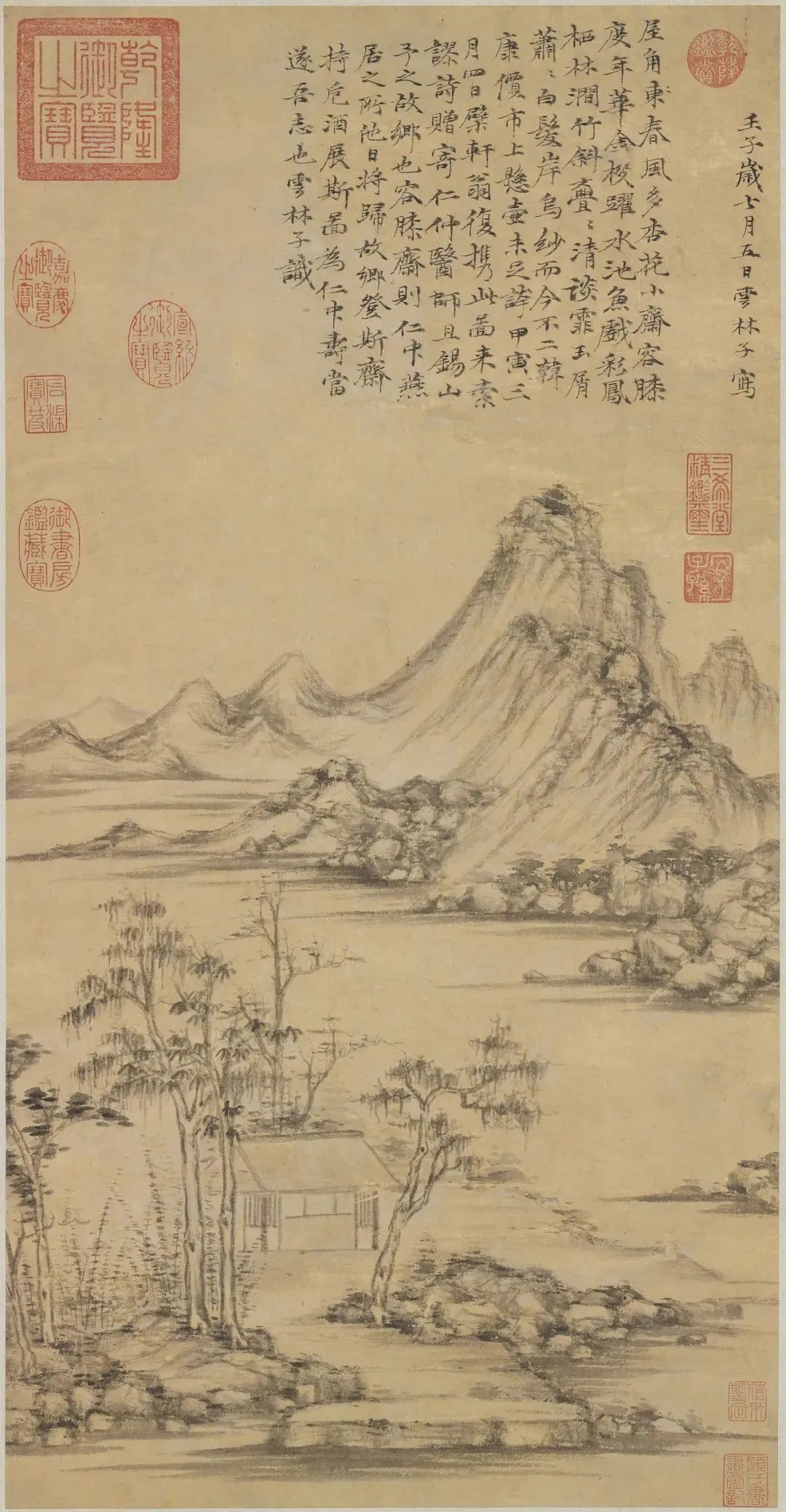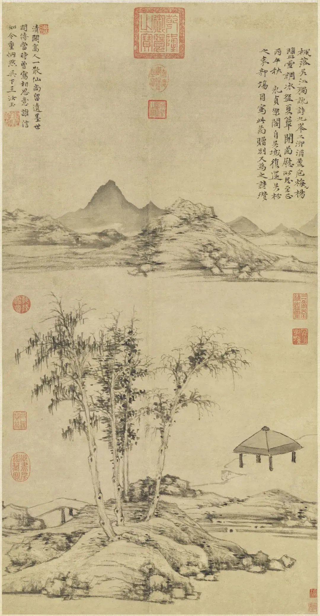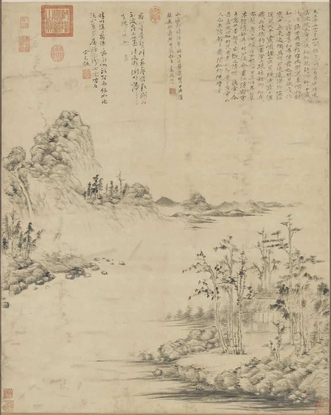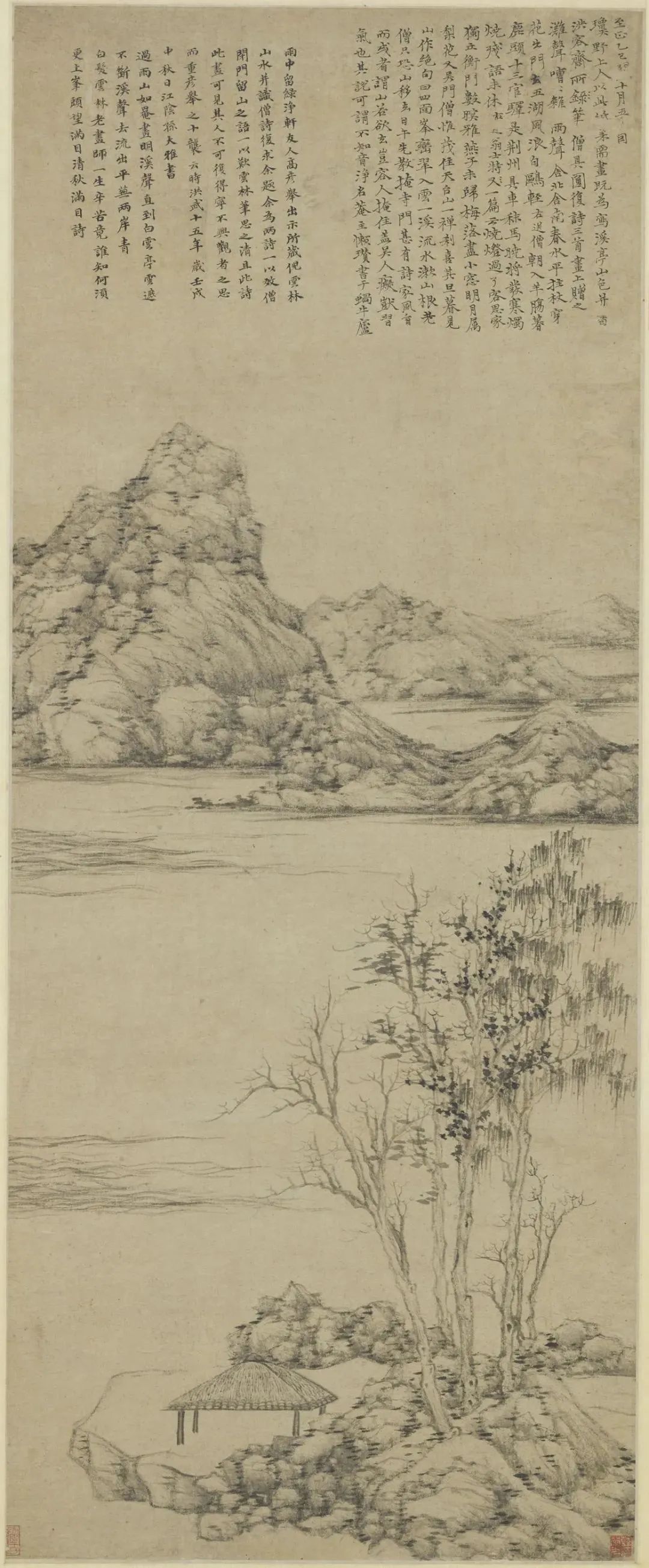 在倪瓒晚年山水画中,自然山水的表现是倪瓒追求的重要主题之一。禅宗美学强调人与自然的和谐统一,倪瓒通过绘制自然景物来展现这种和谐的观念。他善于以山川、水流、树木等自然元素为主题,通过简练的笔墨和抽象的构图来表现自然景物的气势和韵味。
