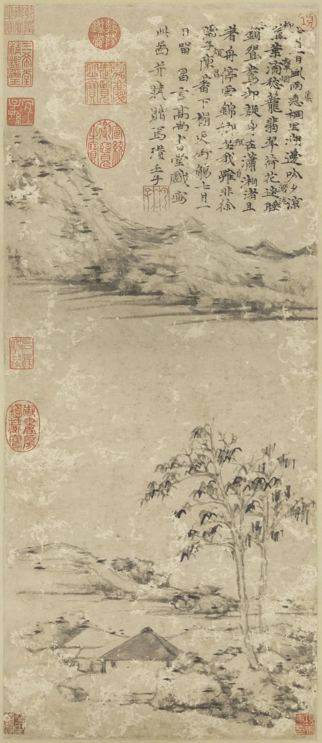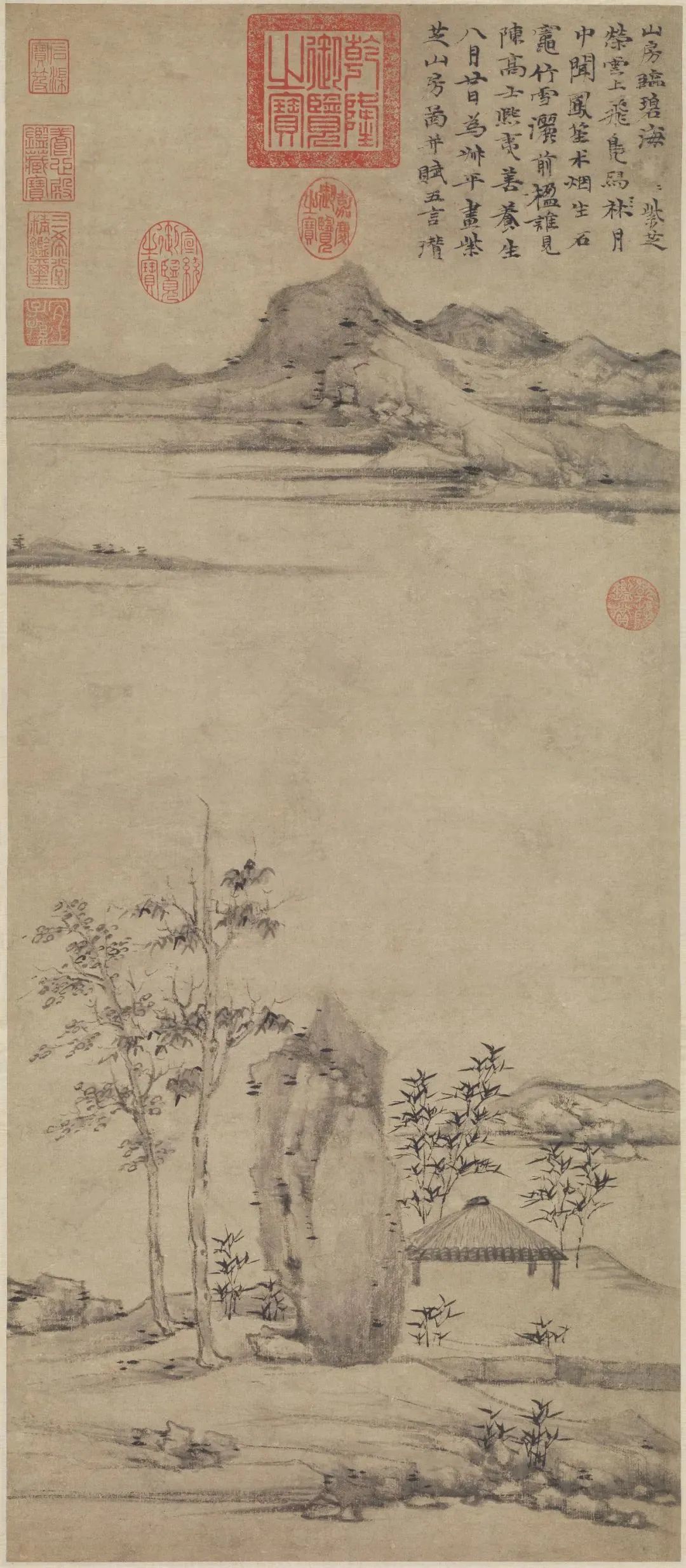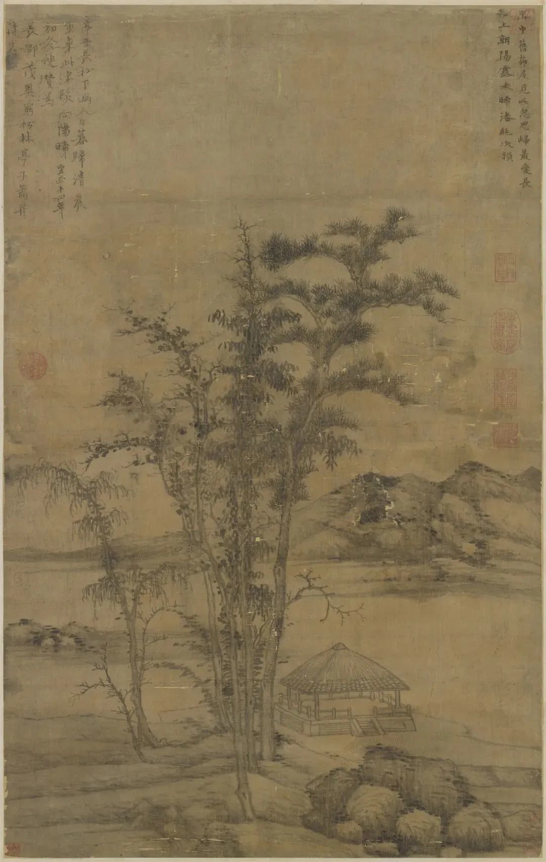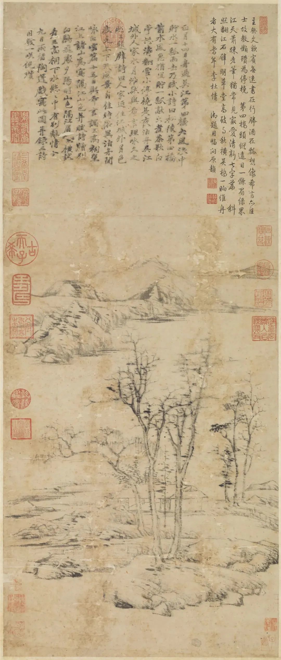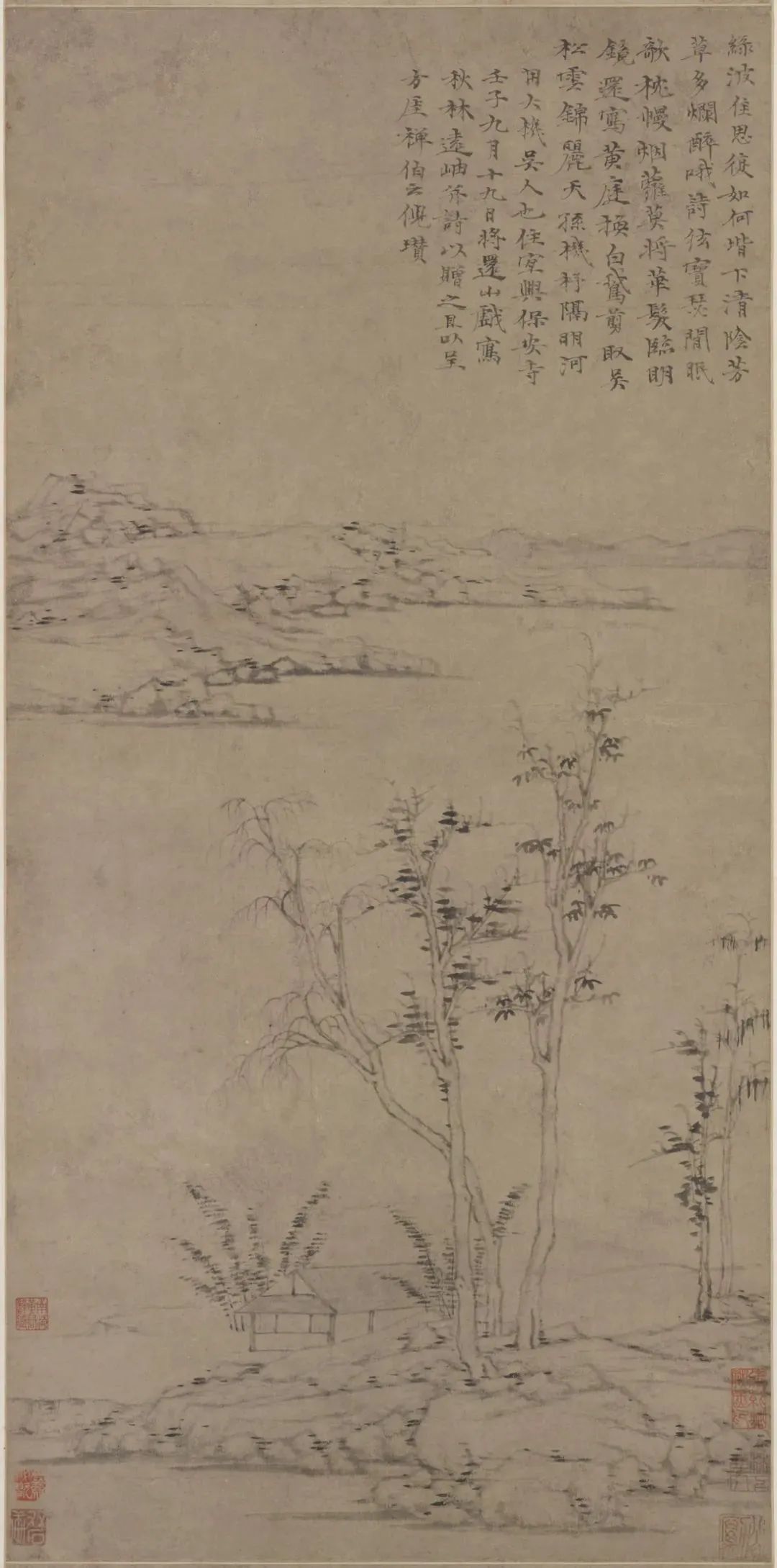 在倪瓒晚年山水画中,自然山水的表现是倪瓒追求的重要主题之一。禅宗美学强调人与自然的和谐统一,倪瓒通过绘制自然景物来展现这种和谐的观念。他善于以山川、水流、树木等自然元素为主题,通过简练的笔墨和抽象的构图来表现自然景物的气势和韵味。