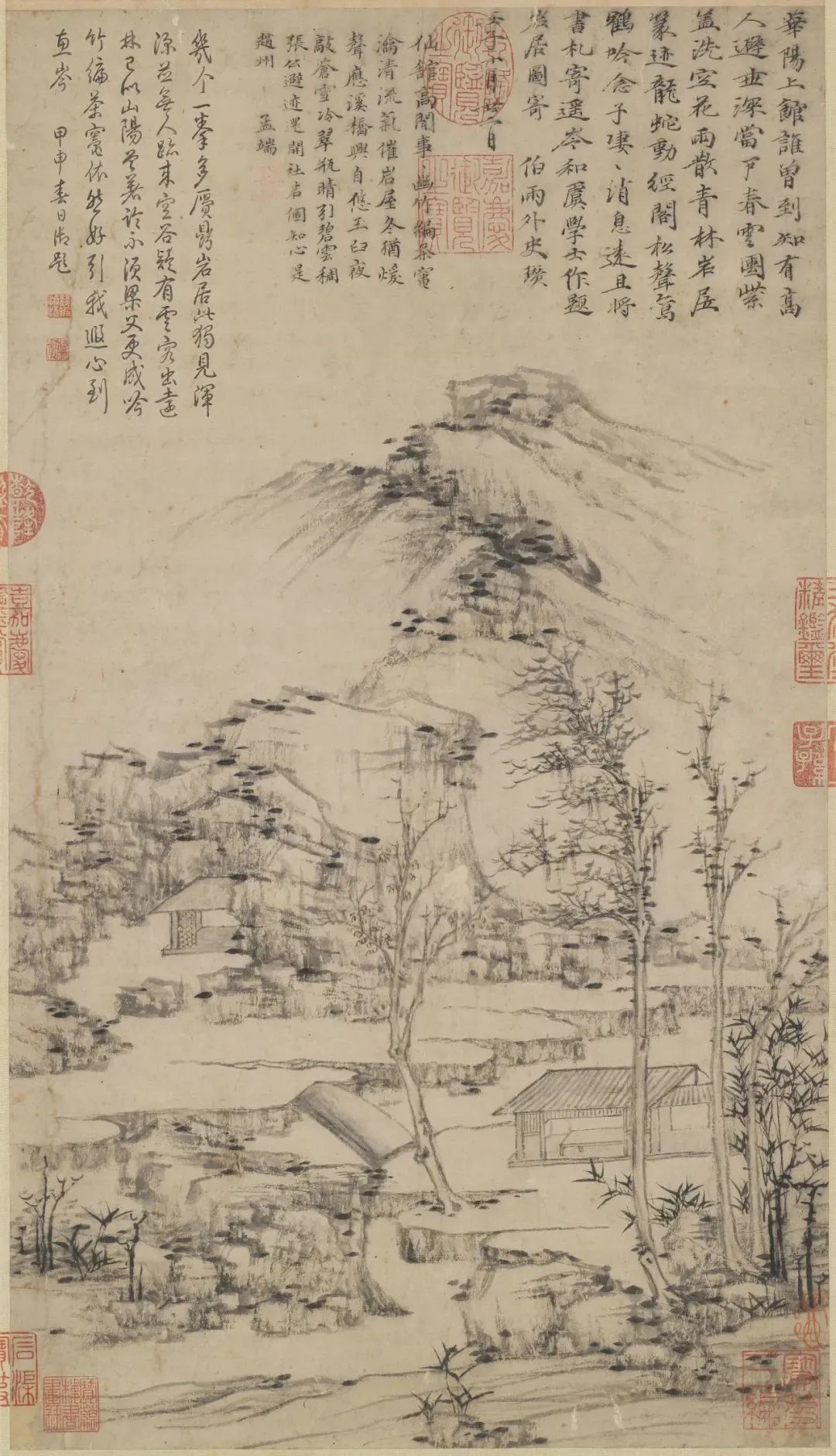 另外,倪瓒在作品中充分利用墨色的纹理效果来营造作品的氛围。通过墨色的笔触和纹理的运用,他能够生动地描绘出山石的坚实感、水流的流动感以及树木的丰茂感。这些纹理的效果赋予了作品以生动和具体的形象,使观者能够感受到自然景物的实在和存在感。