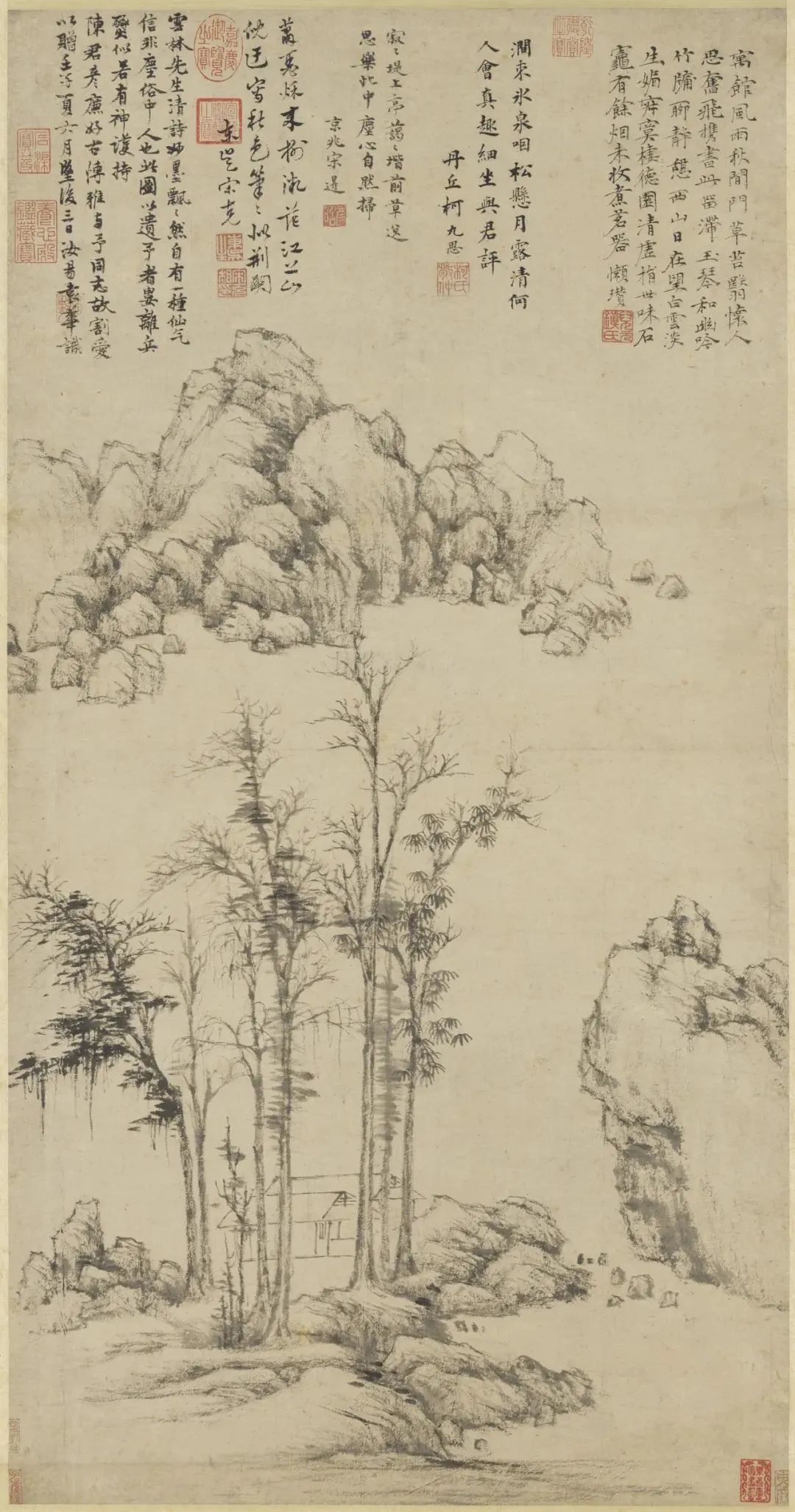墨韵与墨趣是倪瓒晚年山水画中的重要艺术享受。他通过墨色的运用和纹理的表现,赋予作品以丰富的视觉体验和情感内涵。