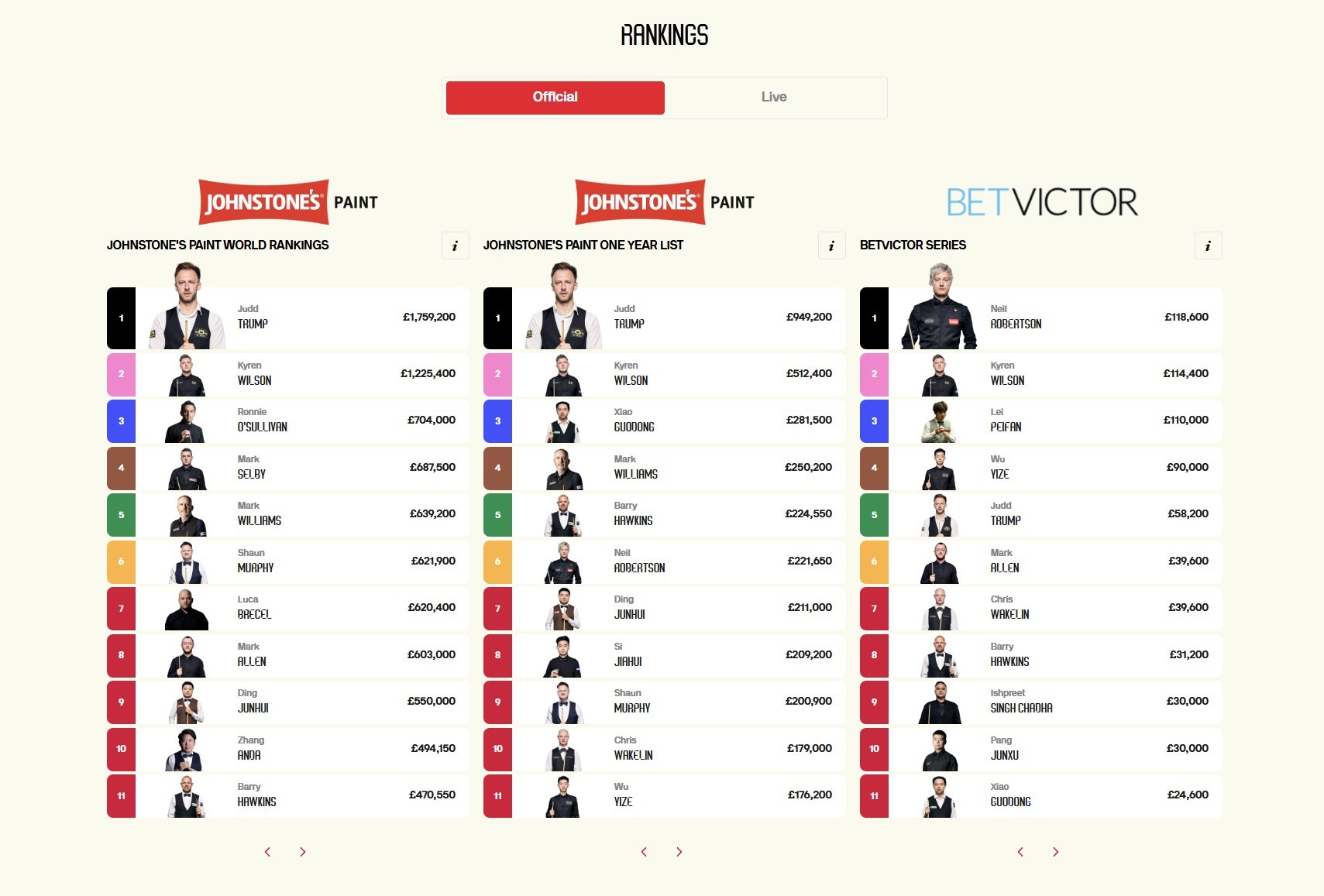 世界前十方面,贾德-特鲁姆普位列榜首、凯伦-威尔逊紧随其后,罗尼-奥沙利文第3。马克-塞尔比第4、马克-威廉姆斯第5、肖恩-墨菲第6、卢卡-布雷塞尔第7、马克-艾伦第8、丁俊晖第9、张安达第10。