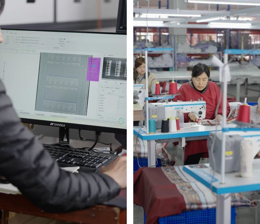 姚弛行的员工有00后,也有50多岁的阿姨。00后负责设计,操作电脑。四五十岁的阿姨把孩子送去上学,到工厂计件制作,平均收入月薪六七千。