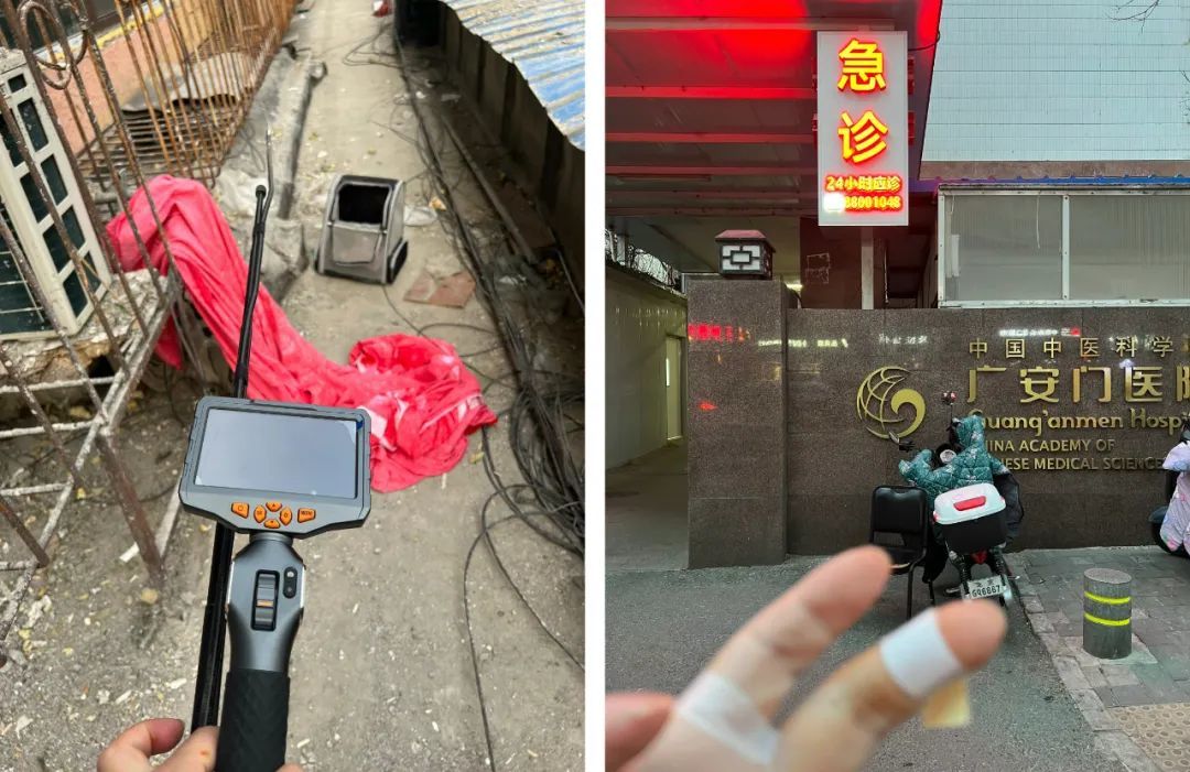 左:寻找宠物的探测器;右:陈营被找到的小猫咬破四处伤口,有一根手指几乎被咬穿,连夜跑了三家医院才打上疫苗