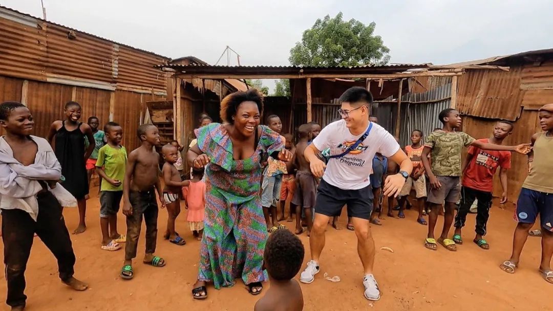 小钟在多哥的一个城中村,与当地村民一起跳舞