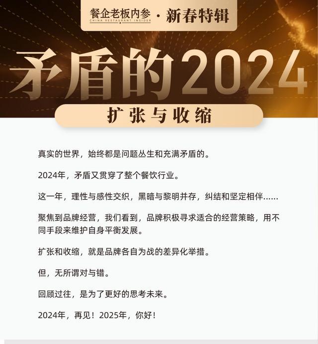 过去的2024年,餐饮行业风云变幻,各品牌在复杂的环境中各展身手。有品牌创造生意奇迹、实现门店良性扩张,有品牌聚焦战略收缩,理性面对大环境。