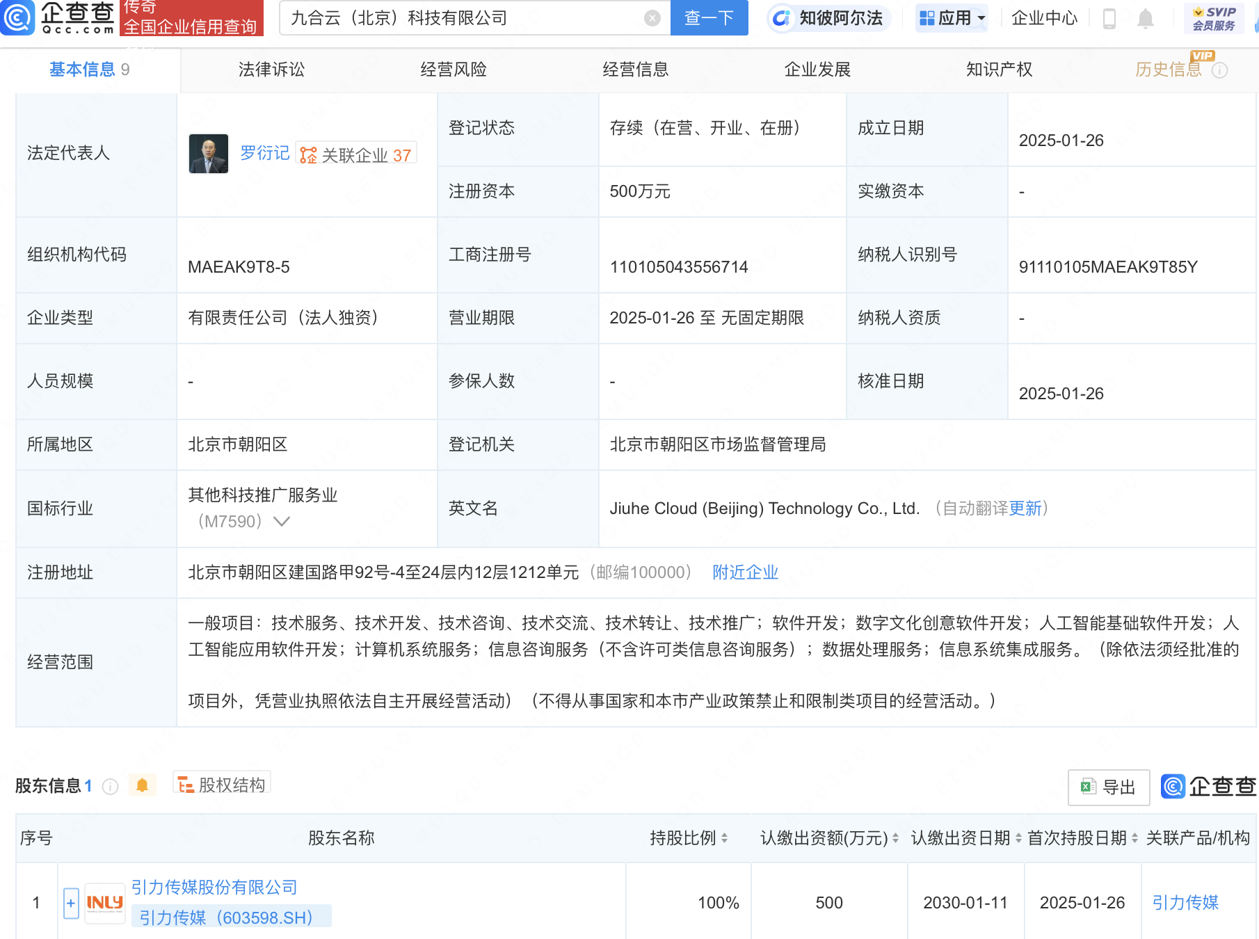 企查查APP显示,近日,九合云(北京)科技有限公司成立,法定代表人为罗衍记,注册资本500万元,经营范围包含:数字文化创意软件开发;人工智能基础软件开发;人工智能应用软件开发等。企查查股权穿透显示,该公司由引力传媒(603598)全资持股。