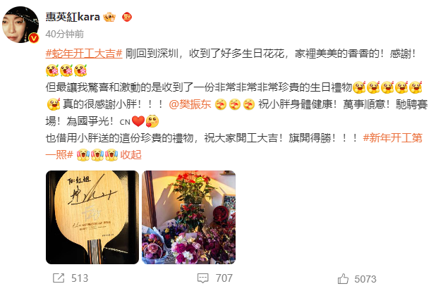 惠英红写道:“刚回到深圳,收到了好多生日花花,家里美美的香香的!感谢!但最让我惊喜和激动的是,收到了一份非常非常非常珍贵的生日礼物,真的很感谢小胖!祝小胖身体健康!万事顺意!驰骋赛场!为国争光!也借用小胖送的这份珍贵的礼物,祝大家开工大吉!旗开得胜!”