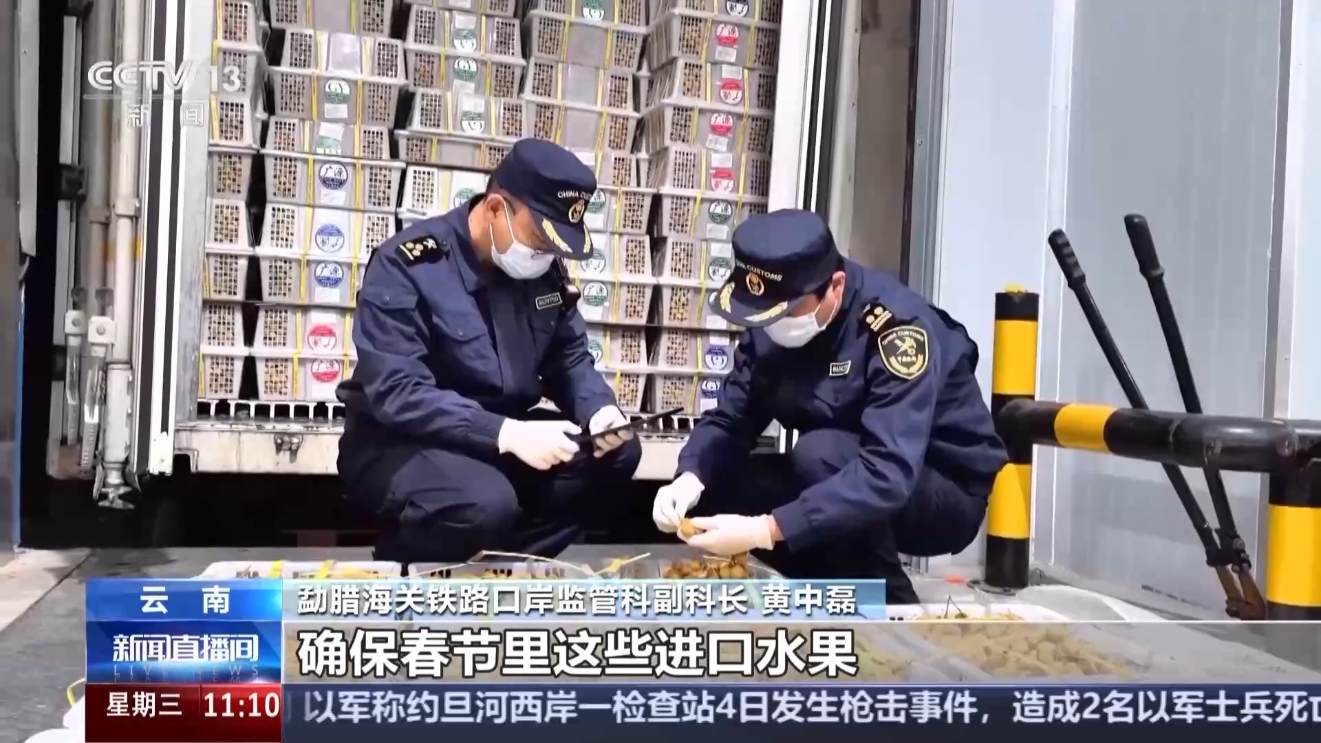 勐腊海关铁路口岸监管科副科长 黄中磊:春节期间往来的货运量特别大,每天有11对列车,比平时还高出了22%,尤其是果蔬这种鲜活农产品居多。我们专门开辟了鲜活易腐农产品“绿色通道”,确保春节里这些进口水果能及时送上百姓餐桌。