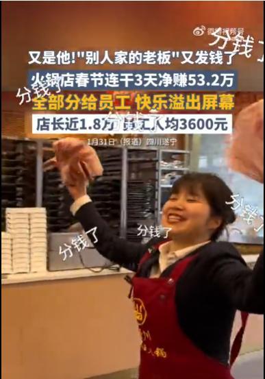 春节期间,四川遂宁一家火锅店登上《人民日报》,原因是,店老板将除夕到初二3天净赚的53.2万全发给员工,有的店长能拿到7000元,普通员工最低也有六七百元。