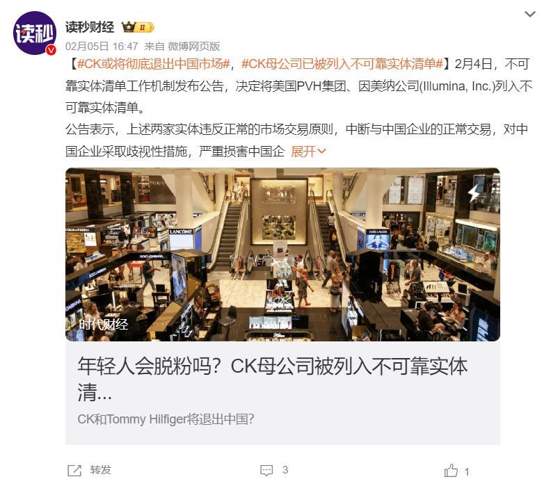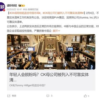 #CK或将彻底退出中国市场#知名服装品牌CK的母公司PVH集团被中国列入“不可靠实体清单”。