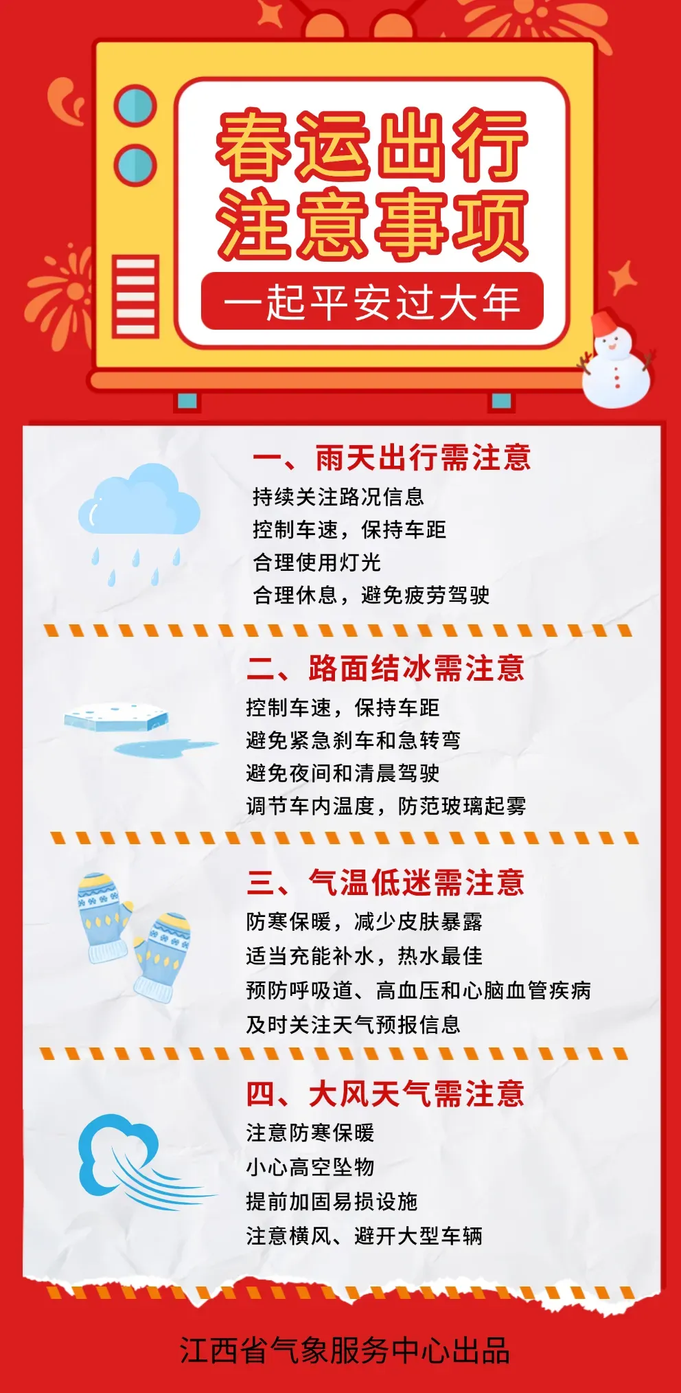 1.加强春运旅游安全管理。降水天气将导致道路湿滑,能见度较低,对春运、旅游有一定影响,目前正值假期后返程高峰,需加强春运、旅游等安全管理;居民出行需关注天气变化,注意防寒保暖。